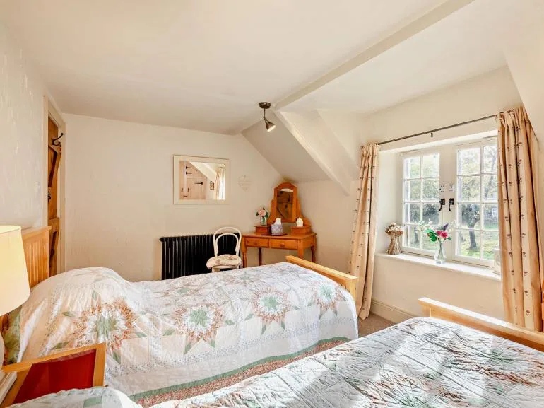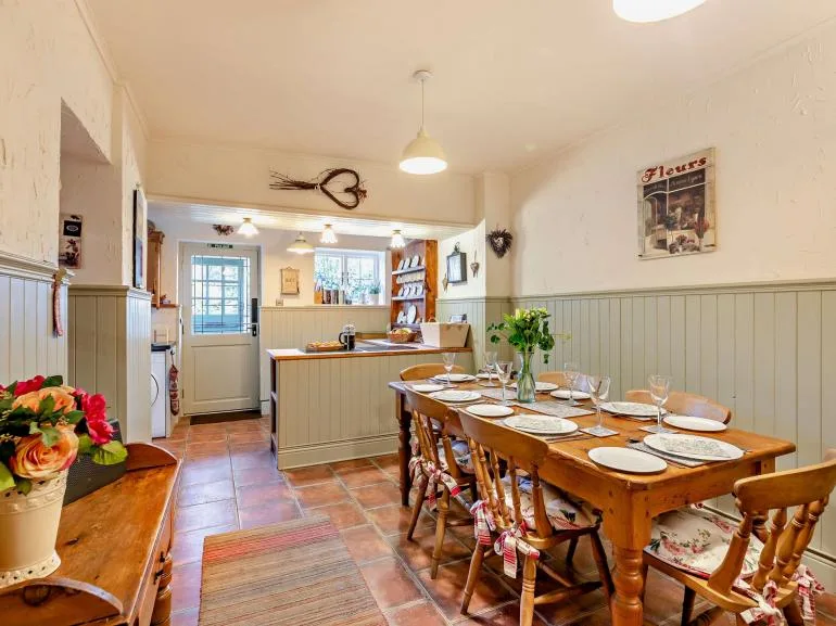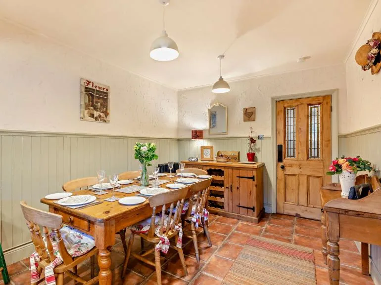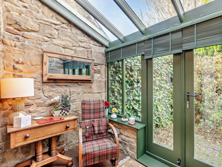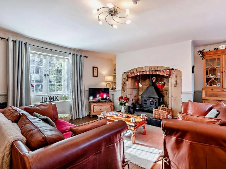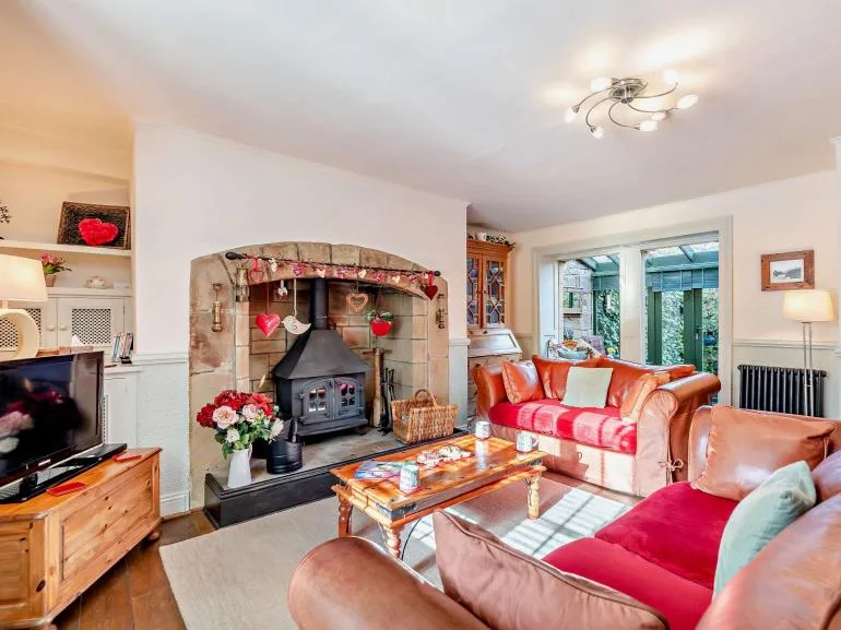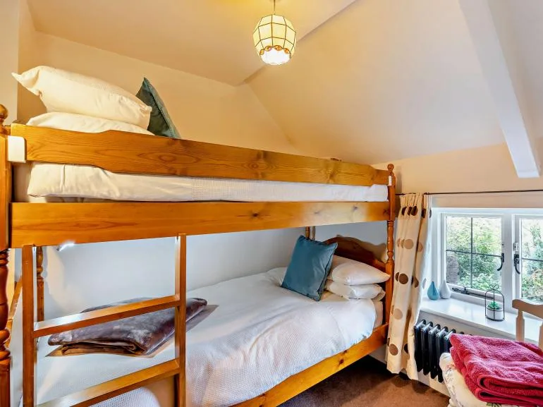 Inside the cottage, you’ll find a warm and elegant lounge with a feature fireplace, wood burner, comfortable seating, and TV – perfect for cosy evenings in. There’s also a spacious dining area, a fully equipped kitchen with modern appliances, and a bright sunroom overlooking the tranquil garden. Upstairs offers three welcoming bedrooms – a double, a twin, and a bunk room – plus a family bathroom and a separate shower room.