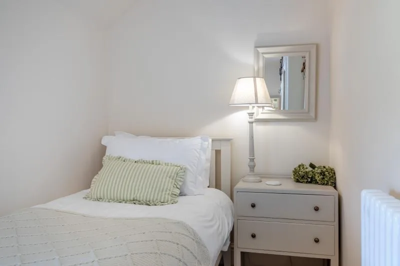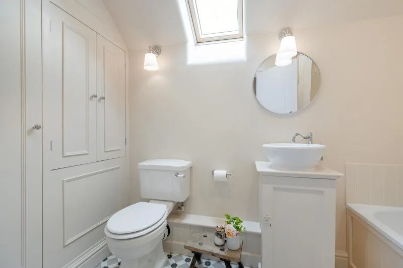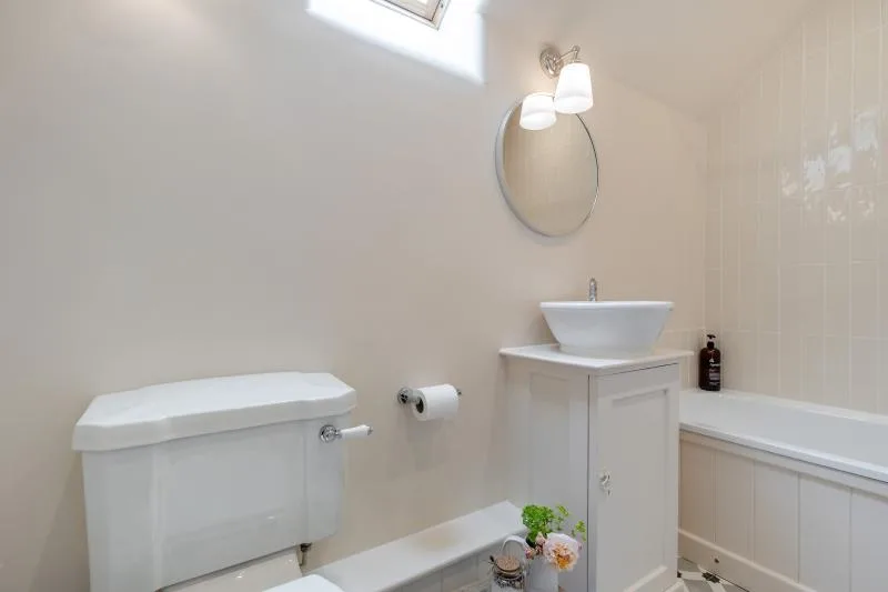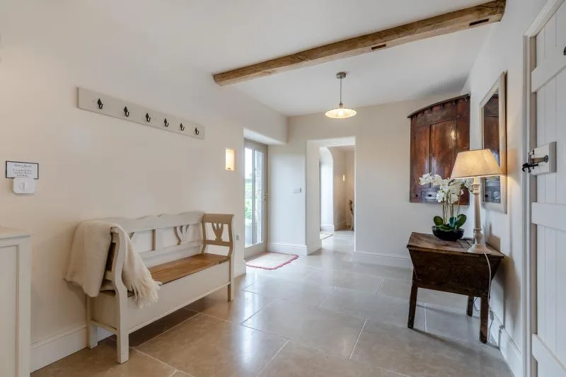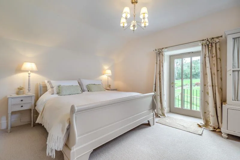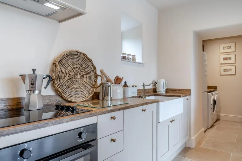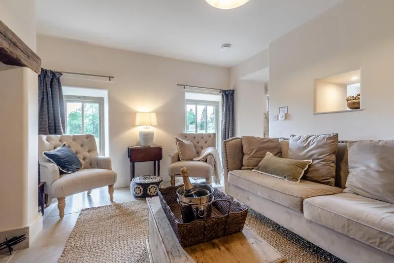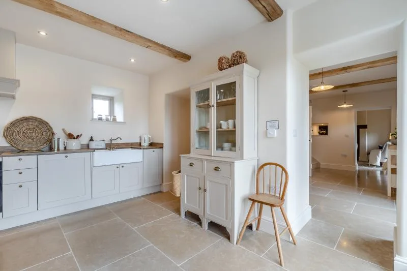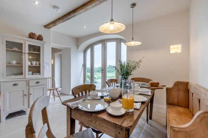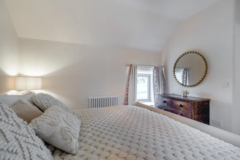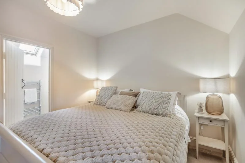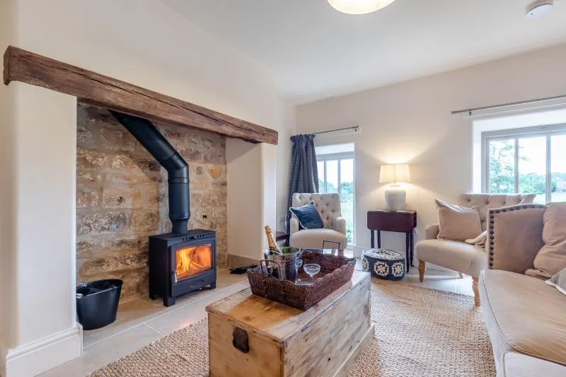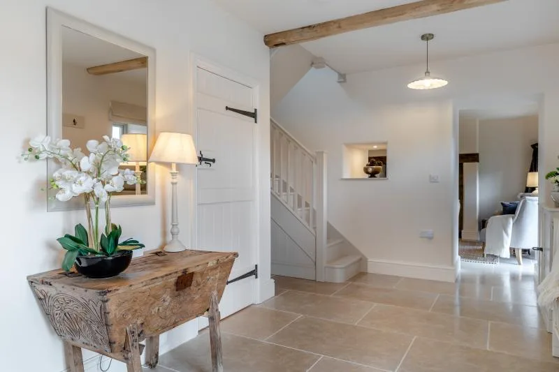 Inside, the cottage combines original character with refined comfort. A welcoming reception hall leads to a stylish lounge, where plush seating surrounds a woodburning stove set in a stone inglenook fireplace, alongside a Smart TV. Across the hall, the country-style kitchen/diner is perfect for sociable meals, with French doors opening on sunny days. A utility room and ground-floor WC add convenience.