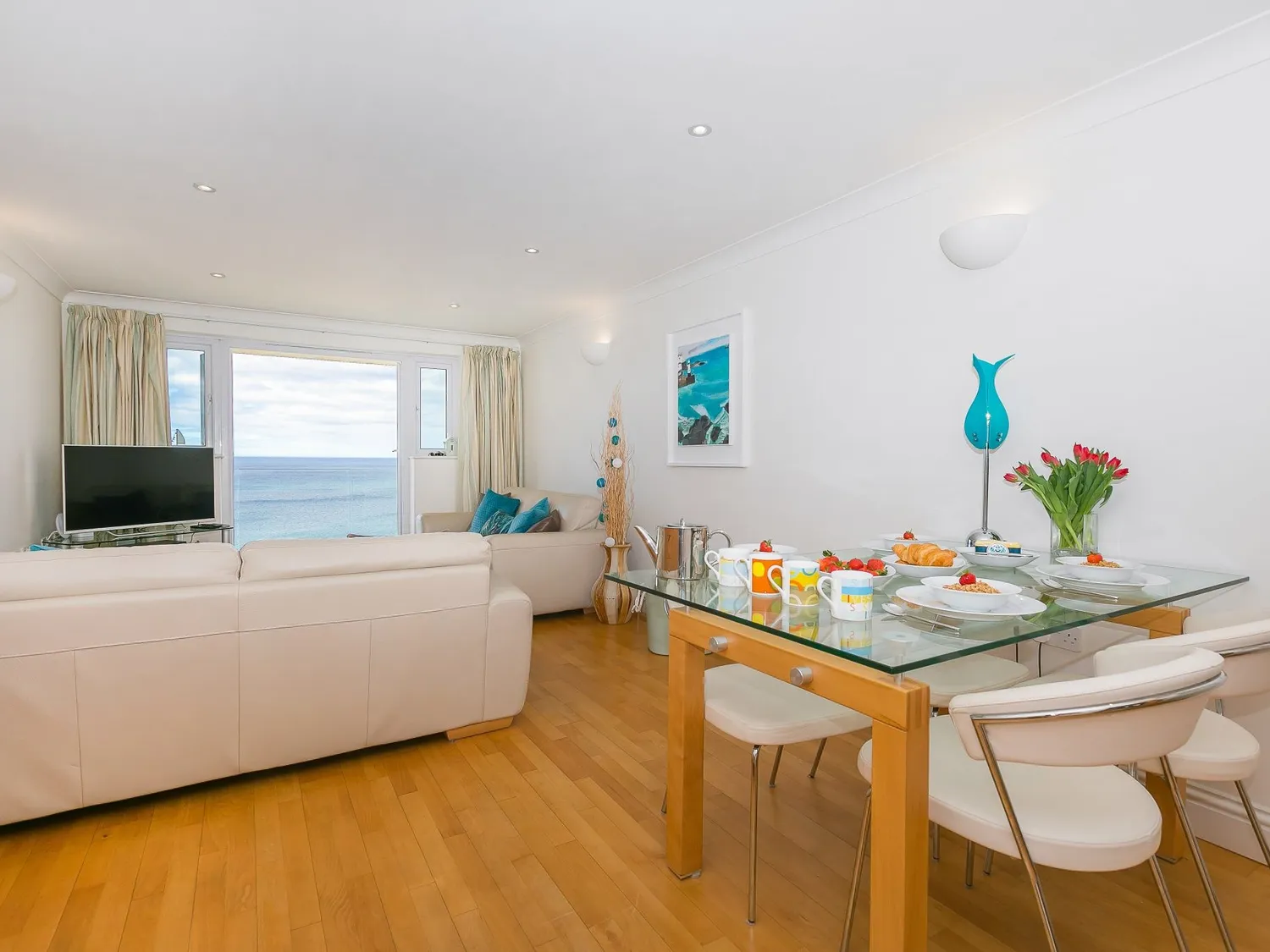 The spacious dining area is part of the open plan living area, it comfortably seats 4 people.Open the patio doors, listen to the waves and wonder at the dramatic views across St. Ives Bay.