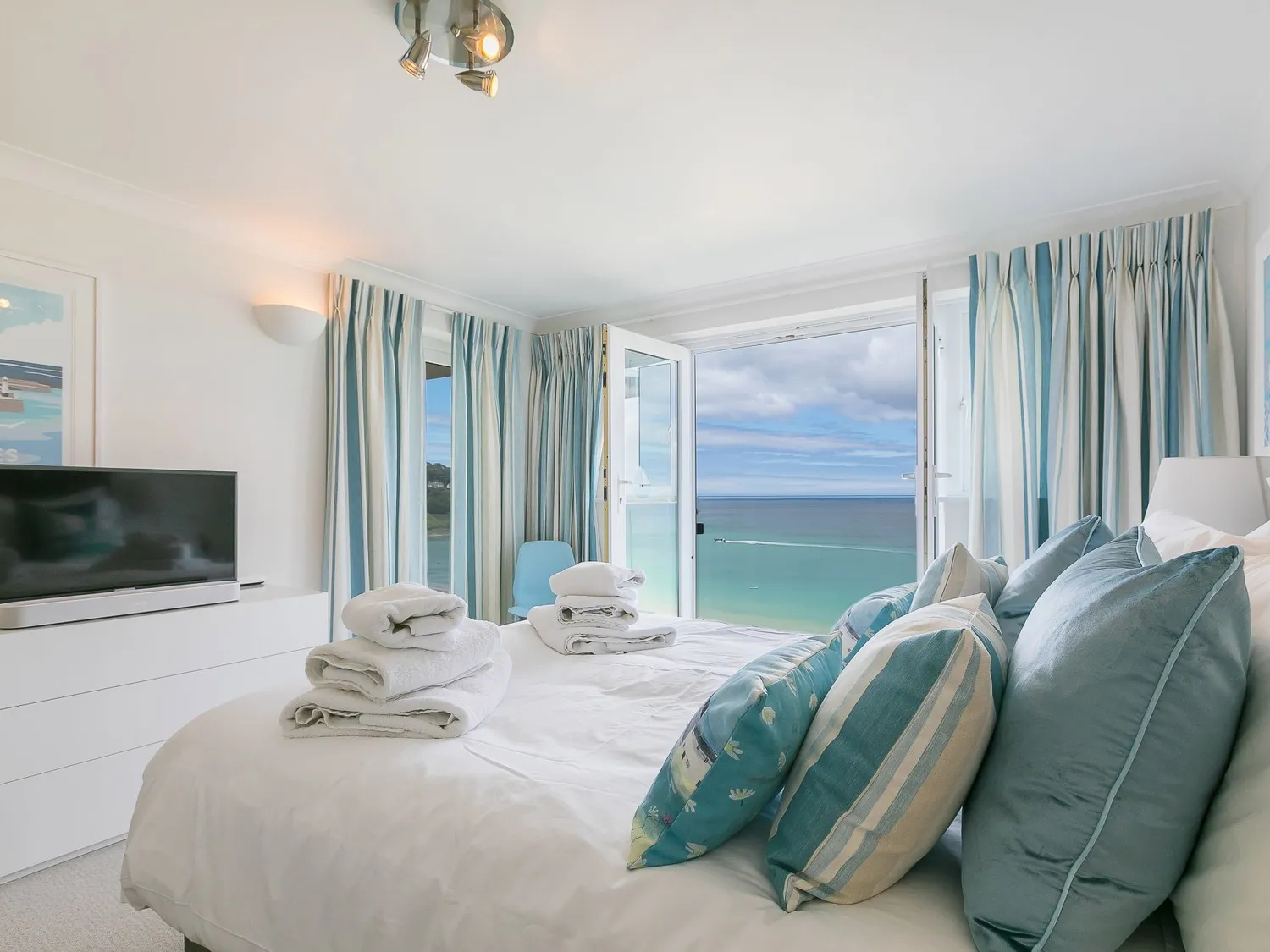 The master en-suite bedroom has panoramic sea views, open the French doors and drift off to sleep to the sound of the surf or enjoy breakfast with a breath-taking view of the bay.