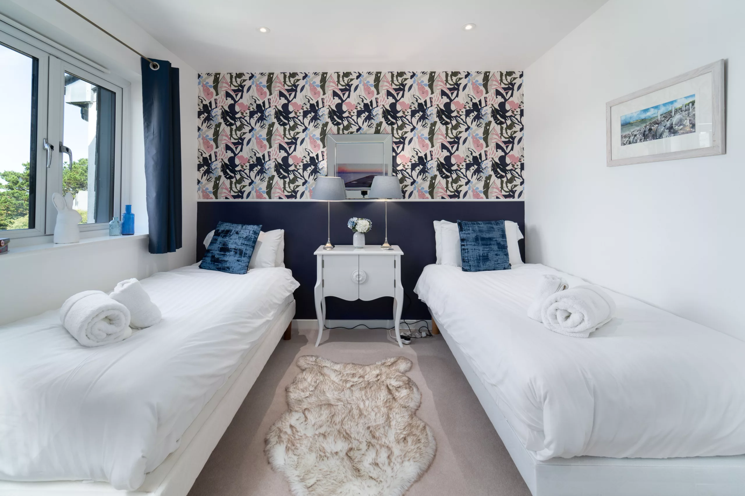 The third bedroom, has two single beds, ample storage and a wall mounted smart TV