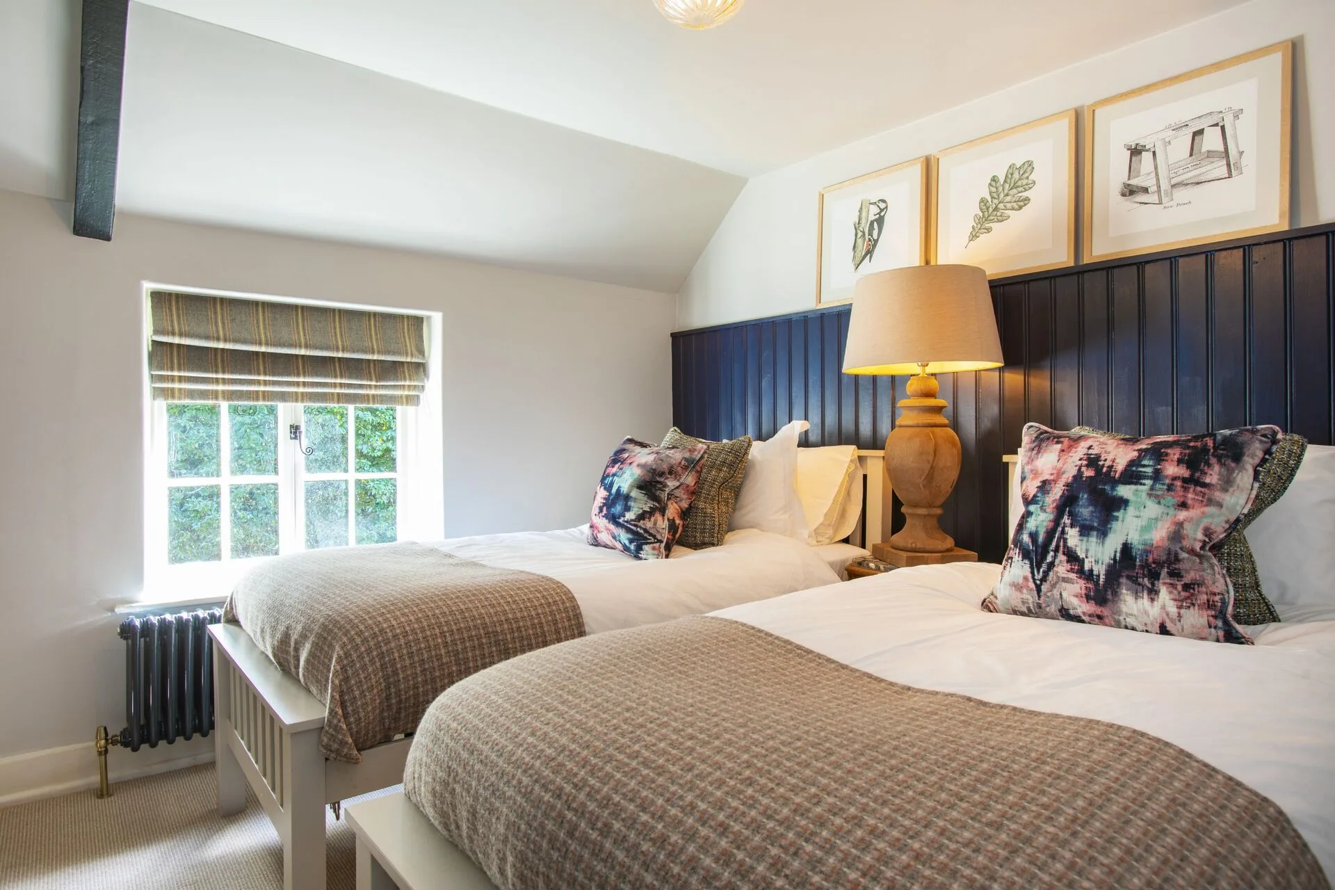 Upstairs, two thoughtfully appointed bedrooms continue the home’s gentle charm. The master bedroom features a sumptuous 5′ king-size bed, while the second bedroom offers twin 3′ single beds, making the cottage ideal for couples, friends, or small families. Both rooms enjoy lovely views across the surrounding woodland and estate gardens, inviting you to wake to birdsong and soft morning light. The modern family bathroom is elegantly designed, complete with a freestanding bath and an overhead shower, providing a luxurious space to unwind and rejuvenate.