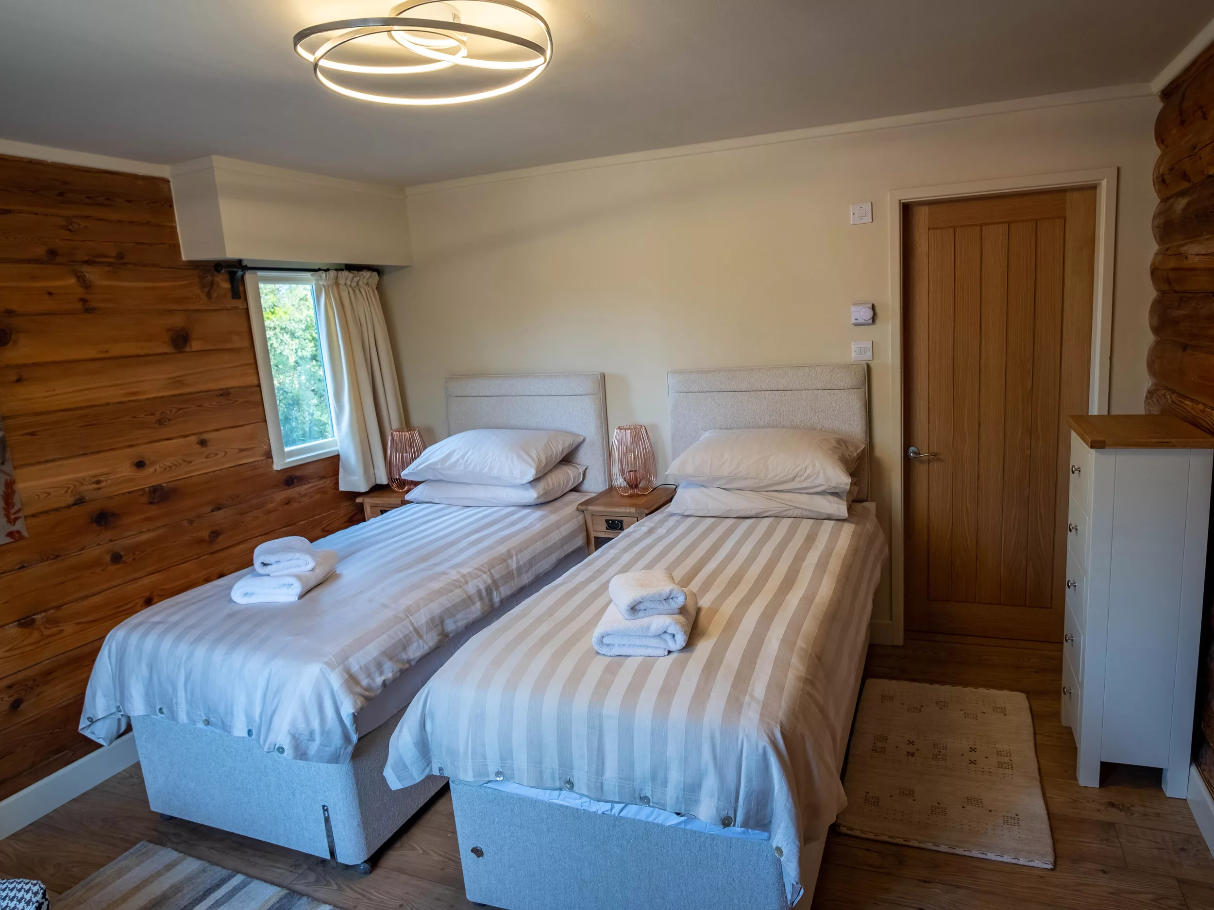Also on the ground floor is a cloakroom and an entertainment room fully stocked with a large TV, PS4 complete with games, reclining sofas and LED customisable mood lighting, a true haven for the little ones to escape to. On the first floor there is a small reading nook on the landing complete with a collection of books and stunning views across the lake and surrounding landscape, followed by another two spacious bedrooms. The master bedroom, with either a super-king-size bed or two singles, leads to a rear balcony overlooking the lake and patio area. The second bedroom comes with either a king-size bed or two singles, each room providing a flexible sleeping arrangement for a variety of group needs as well as a wonderfully stylish interior.