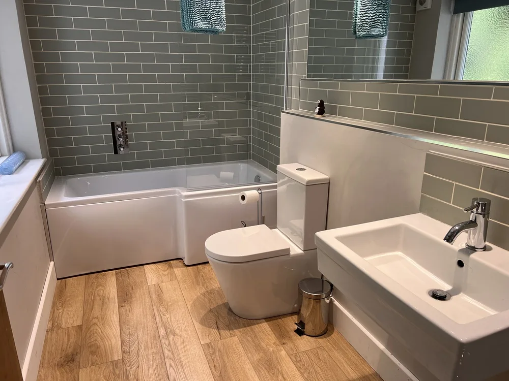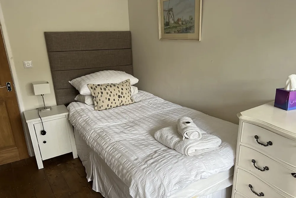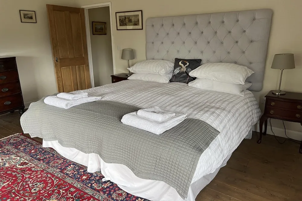 Sleeping up to six guests, the cottage features three inviting bedrooms. The master boasts a super-king bed, the second bedroom an elegant walnut king-size, and the third offers comfortable twin beds. Two bathrooms include a spacious family bathroom with bath and overhead shower, and a modern shower room, both with WC and washbasin. A separate utility room with washing machine and tumble dryer adds convenience for longer stays.