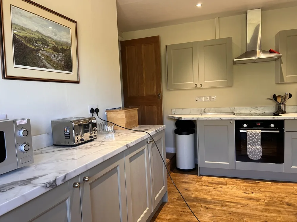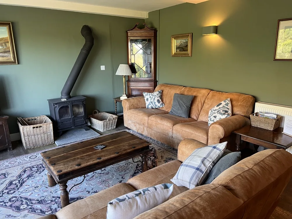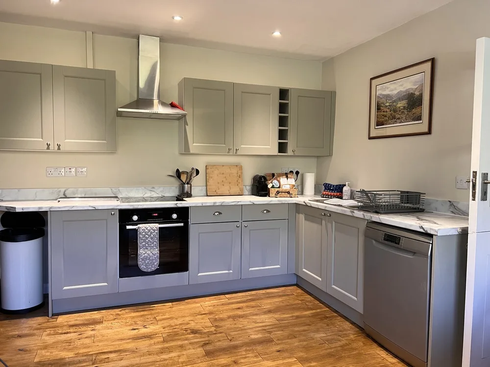 At the heart of the cottage, the large farmhouse kitchen is fully equipped with an American-style fridge freezer, oven and hob, dishwasher, microwave, and a generous dining table perfect for family meals. The spacious lounge, with spectacular views of Catbells and the Newlands Valley, invites you to unwind by the wood-burning stove, enjoy the Smart TV and Apple TV, or surf high-speed Wi-Fi.