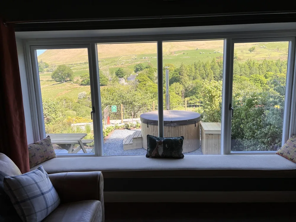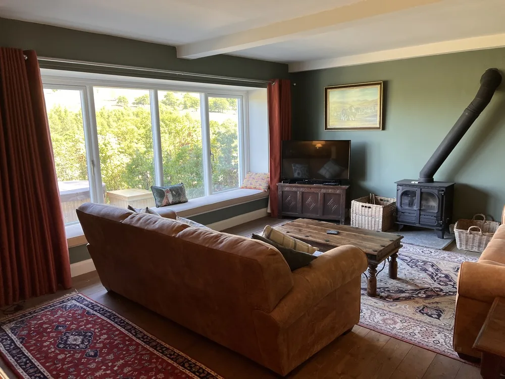 Outside, beautifully landscaped gardens offer open countryside views, a wood-fired hot tub, and a patio with seating for alfresco dining at sunset. Private parking for two cars (with extra spaces available) and an EV charging point provide added convenience. Up to two well-behaved dogs are welcome, so your four-legged friends can join the adventure too.