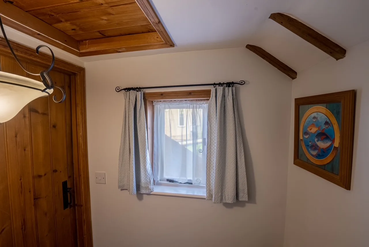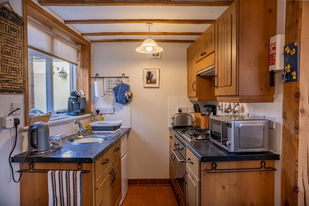 The ground floor features a cosy open-plan living and dining space, perfect for relaxing after a day exploring the area. Comfortable seating, a Smart TV with catch-up services, and a selection of books, maps, and games ensure a relaxing stay. The adjoining kitchen, though compact, is well equipped for preparing meals, with everything you need for a self-catered break, along with welcome essentials on arrival.