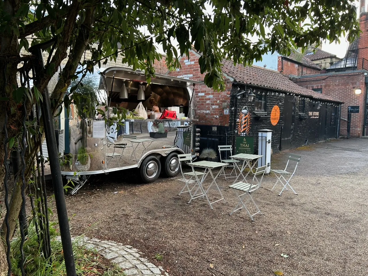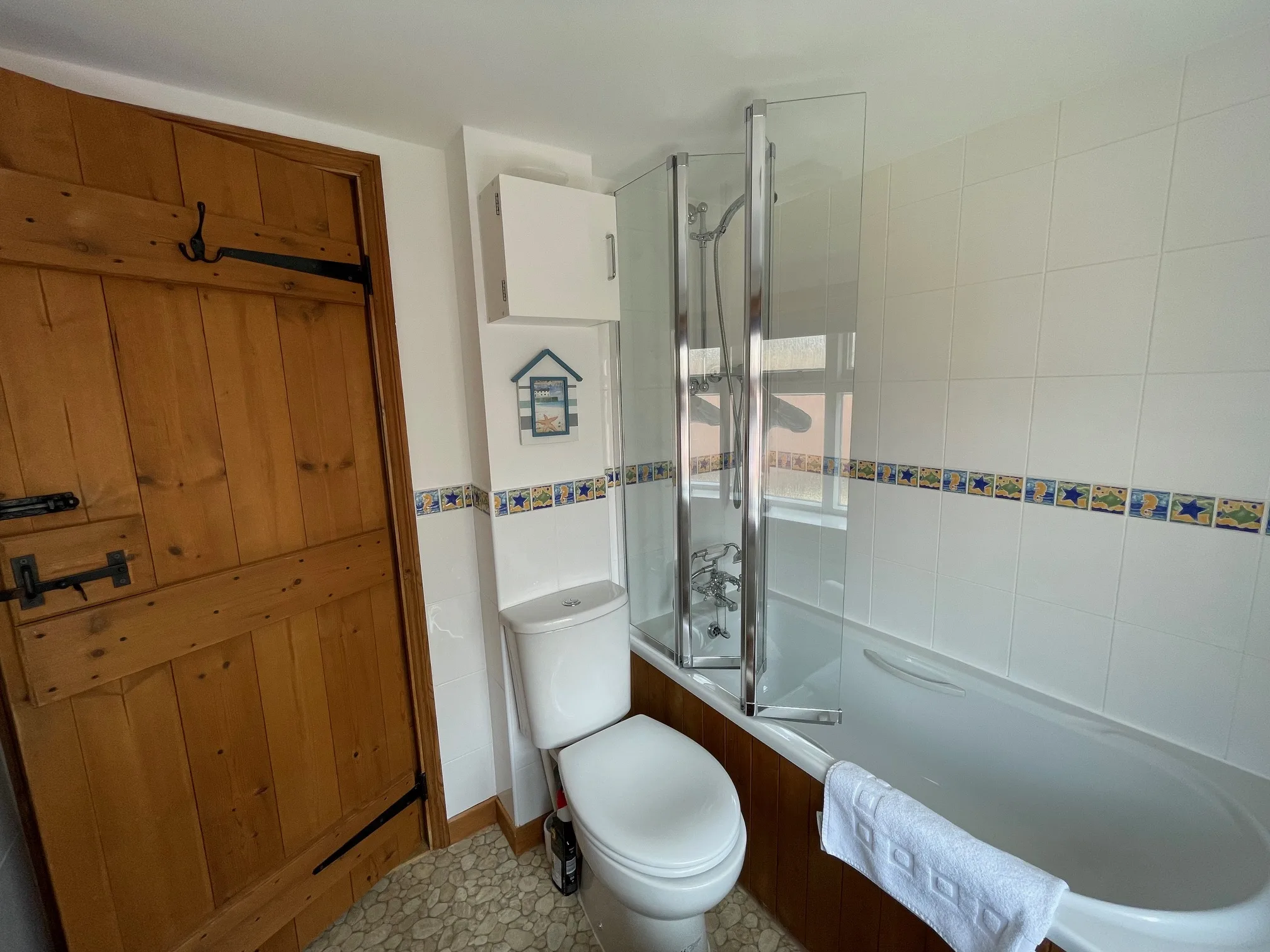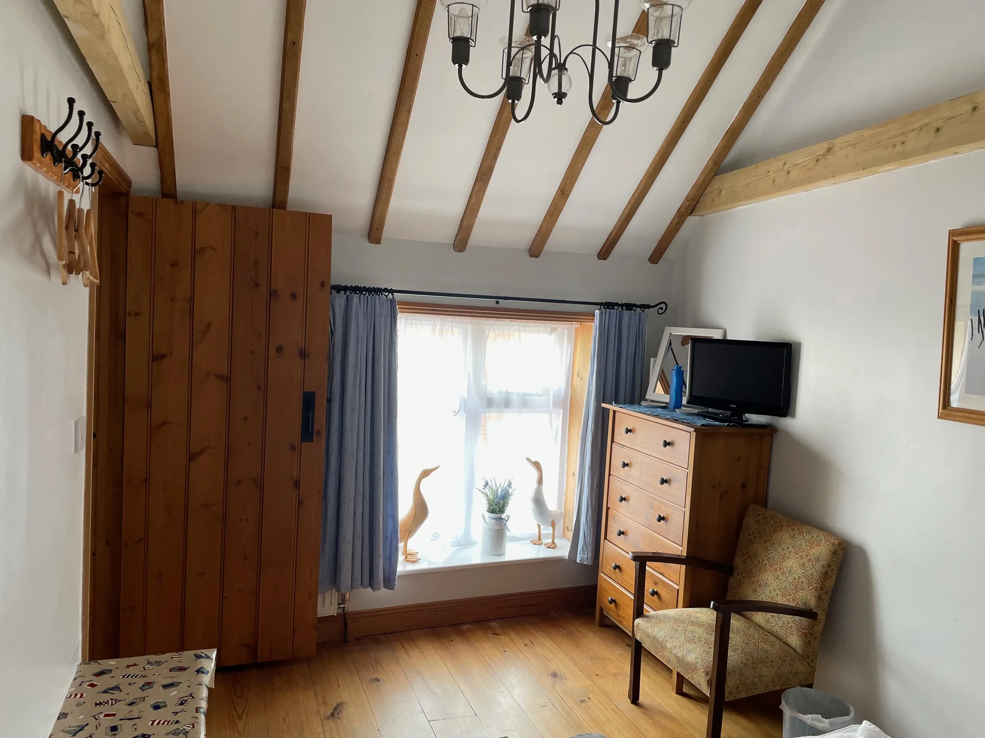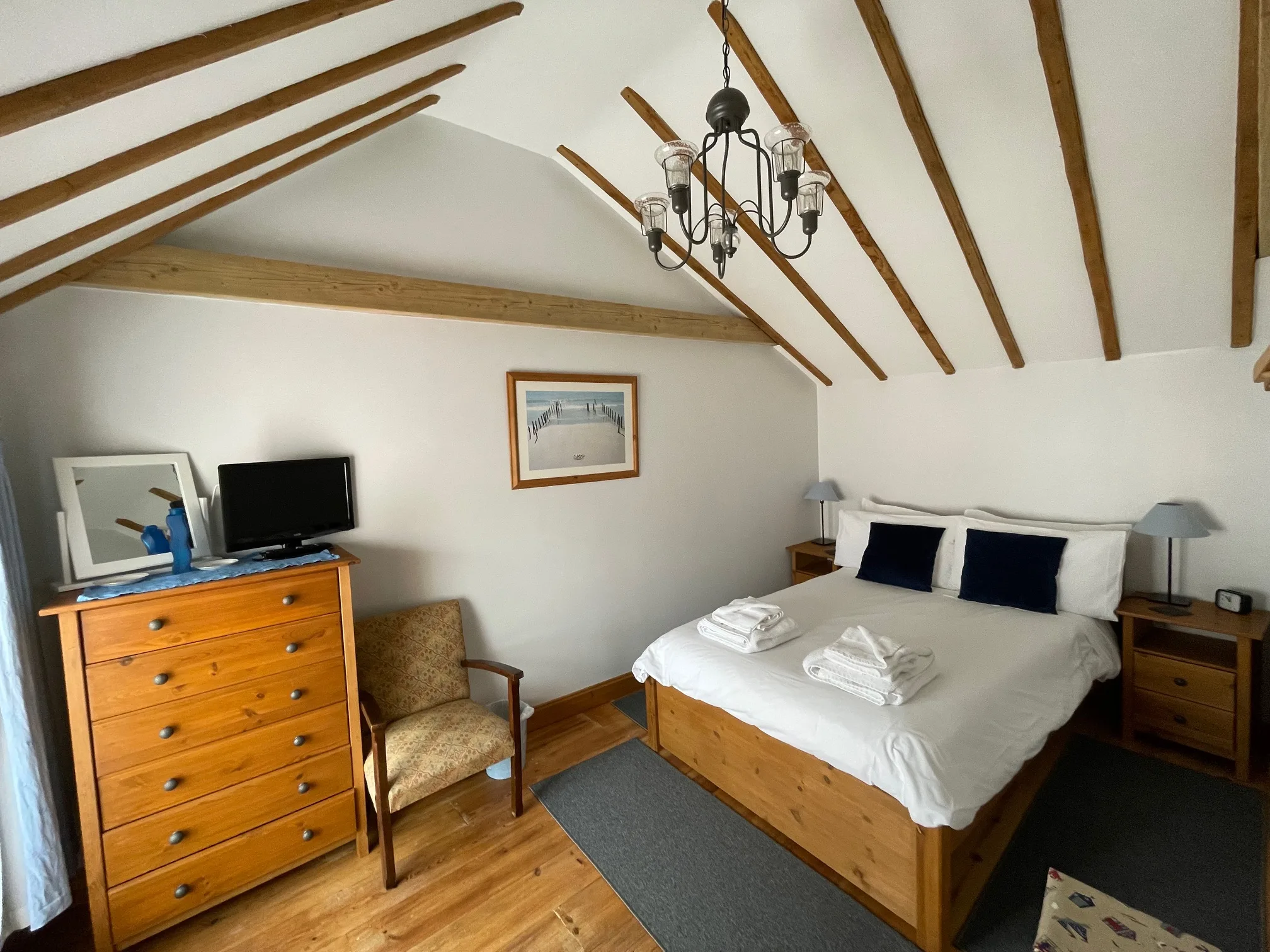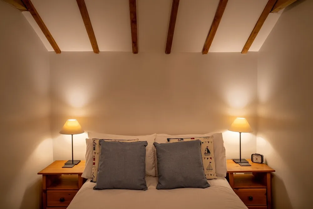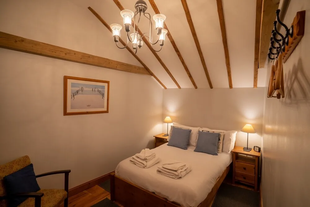 Upstairs, the light and airy bedroom offers a 4ft double bed beneath a vaulted ceiling, creating a calm and restful space. Crisp cotton bed linen and freshly laundered towels are provided, along with storage, blackout curtains, and a second TV. The bathroom features a full-size bath with shower over and a fresh, seaside-inspired design.