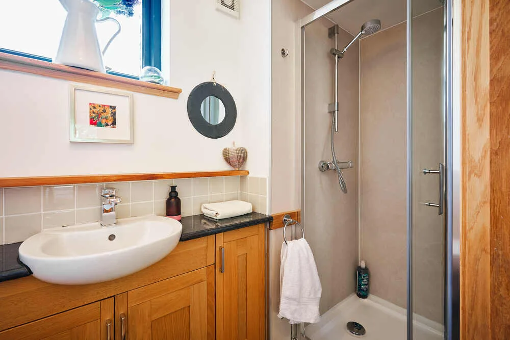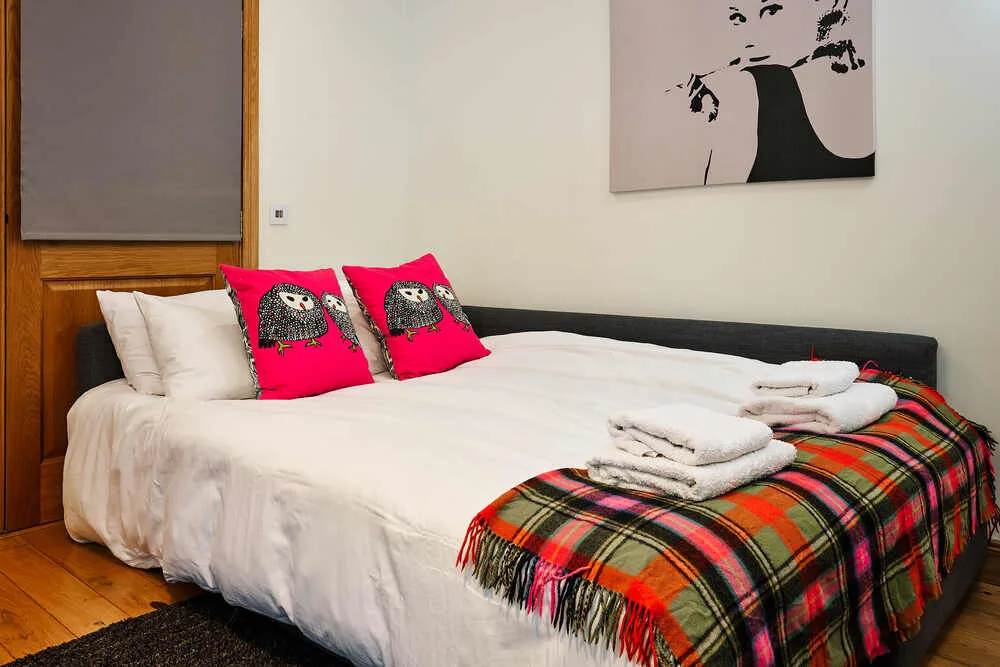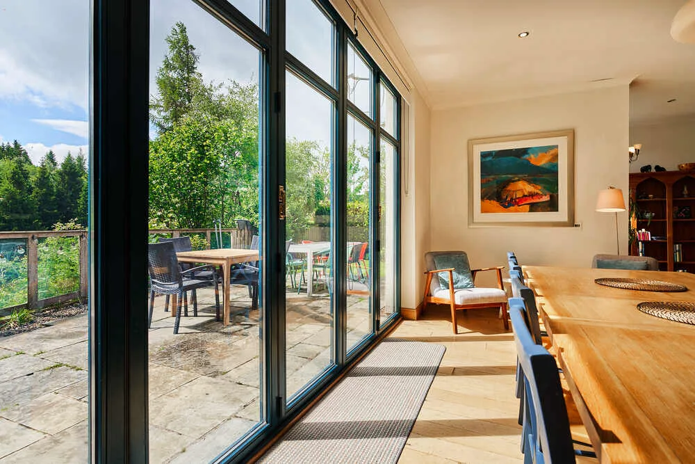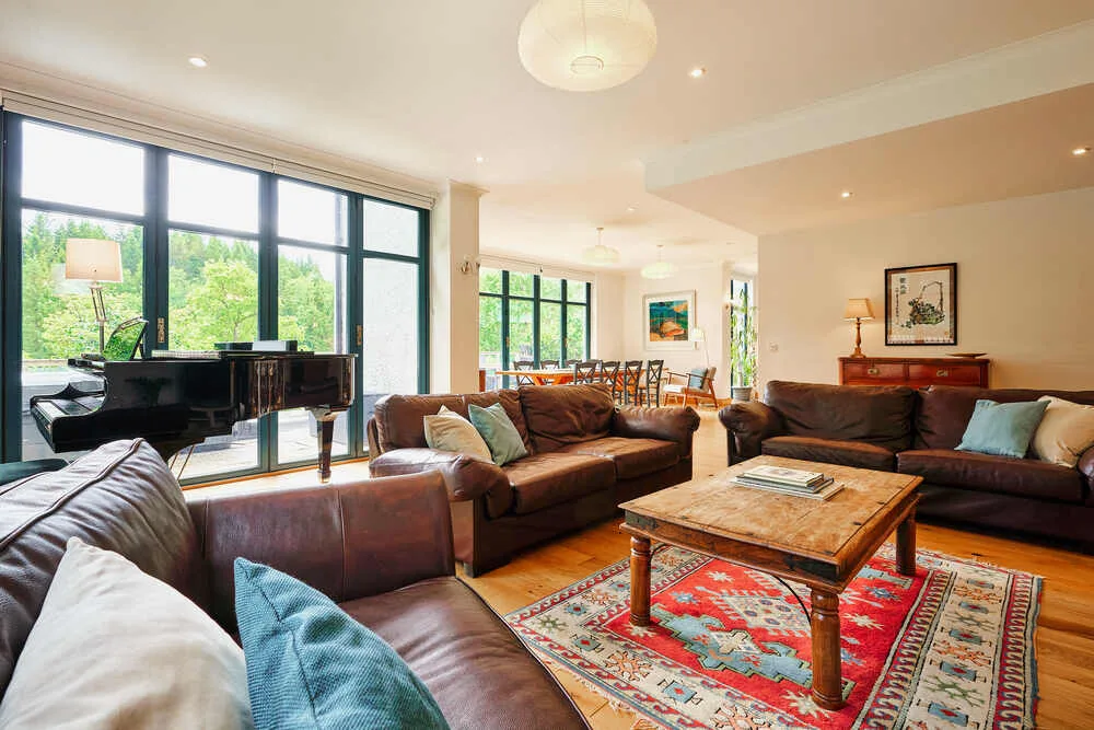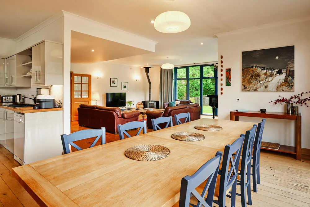 One of the standout features of our house is the very spacious, bright and sunny, open-plan kitchen, diner and living areas – 3 large separate but very much connected zones. With extensive floor to ceiling windows, guests can enjoy fabulous views of the surrounding woodland and hills beyond the river Ardle wherever they happen to be. The living space looks out onto the garden there are 2 large sofas, a ‘love’ chair and 2 easy chairs with a smart TV, (including freesat TV), wood-burning stove, and, for musicians, the grand piano provides an added attraction. A separate smaller living room with football table, board games and a smart TV with L shaped sofa provides additional space for kids in particular to make use of. This room also has a double sofa bed and is adjacent to the downstairs shower room for additional flexible sleeping accommodation.