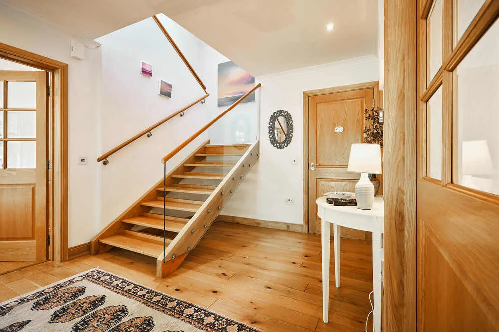 The house has a large vestibule which has ample hanging/storage space for coats/shoes/boots, skis etc. The spacious main hall provides access to the ground floor rooms and staircase to the upper floor. There is a spacious drying/boot room with sink, has washing machine and pulley and a clothes rack for drying.