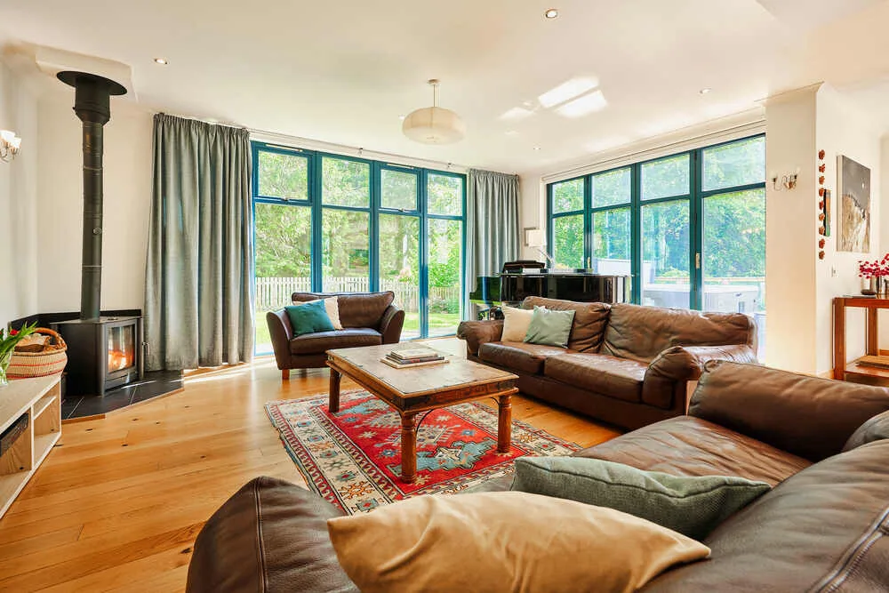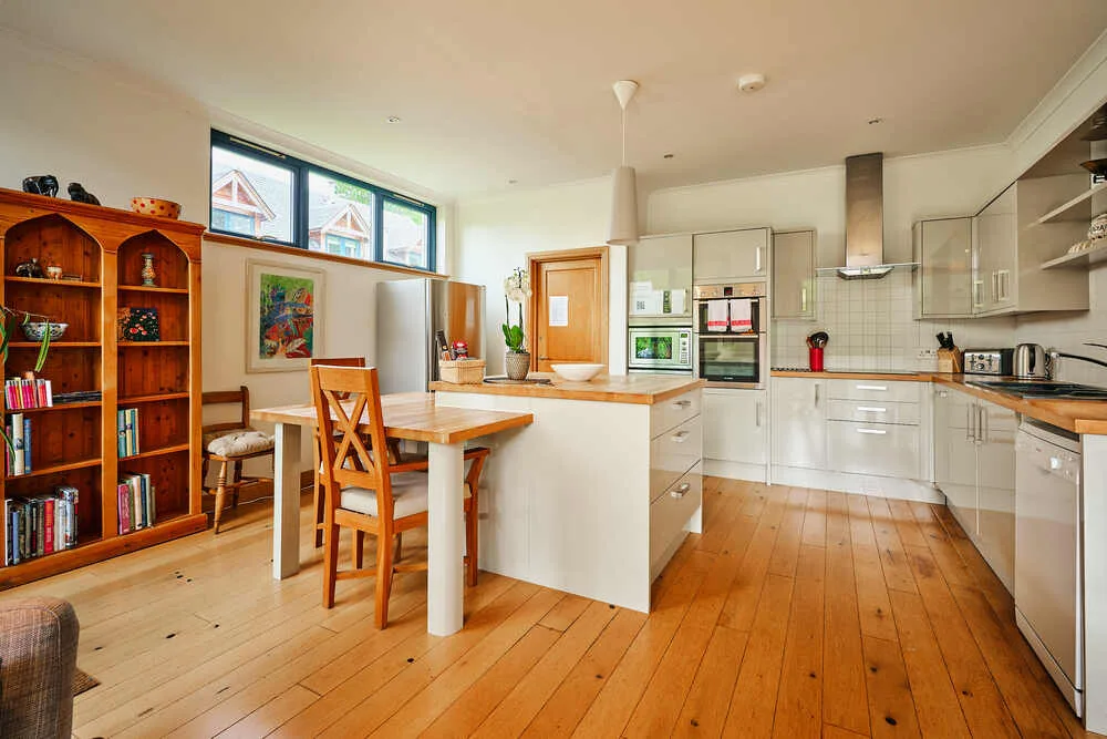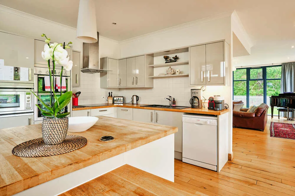 The open-plan kitchen is well equipped with an induction hob, double oven, microwave, large fridge freezer and dishwasher all encompassed together by a large kitchen island and breakfast bar. Appliances include double air fryer, blender, Nespresso vertuo and original machines (as well as filter and french press) and hand mixer for baking enthusiasts!