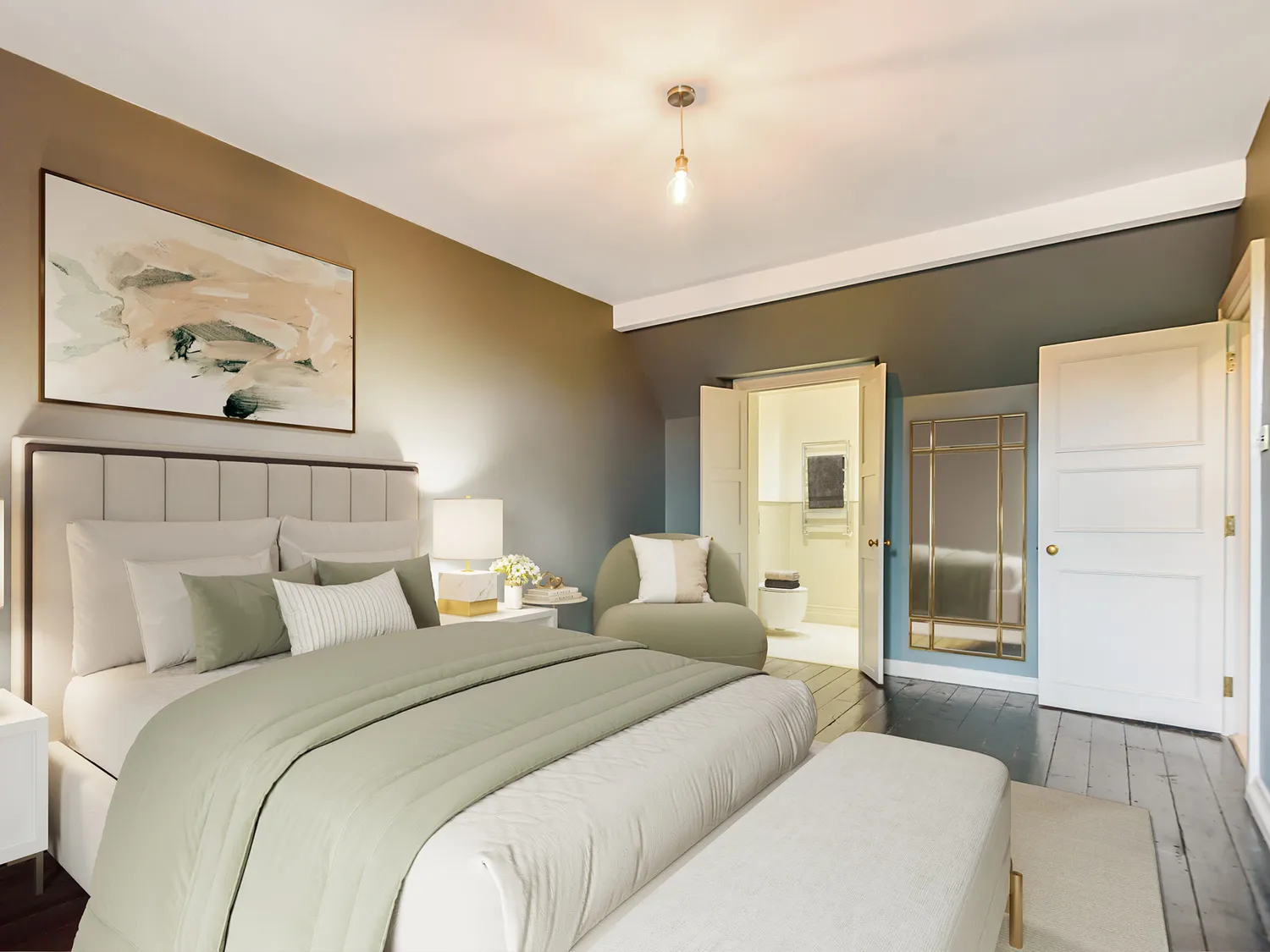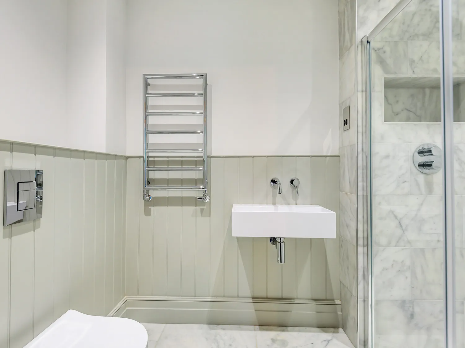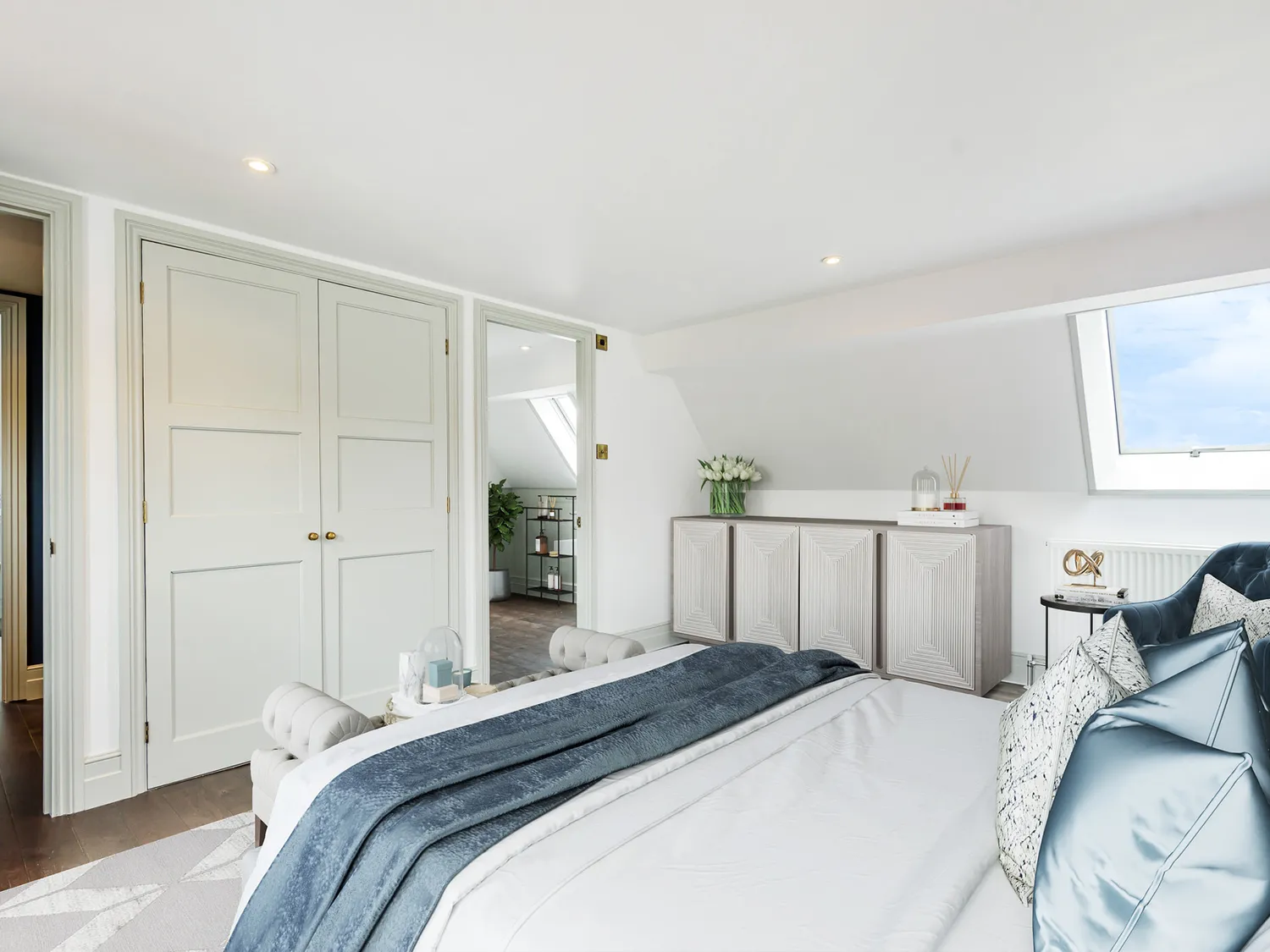 The high-end finish continues upstairs, where you’ll find four bedrooms and three bathrooms. The master suite stands out with exposed flooring, a generous front-facing balcony and a classic marble-tiled en-suite. Another double bedroom includes a charming period fireplace and is served by a luxurious family bathroom with a roll-top bath. The top floor offers a spacious double bedroom with a beautifully finished en-suite, along with a single bedroom or study.