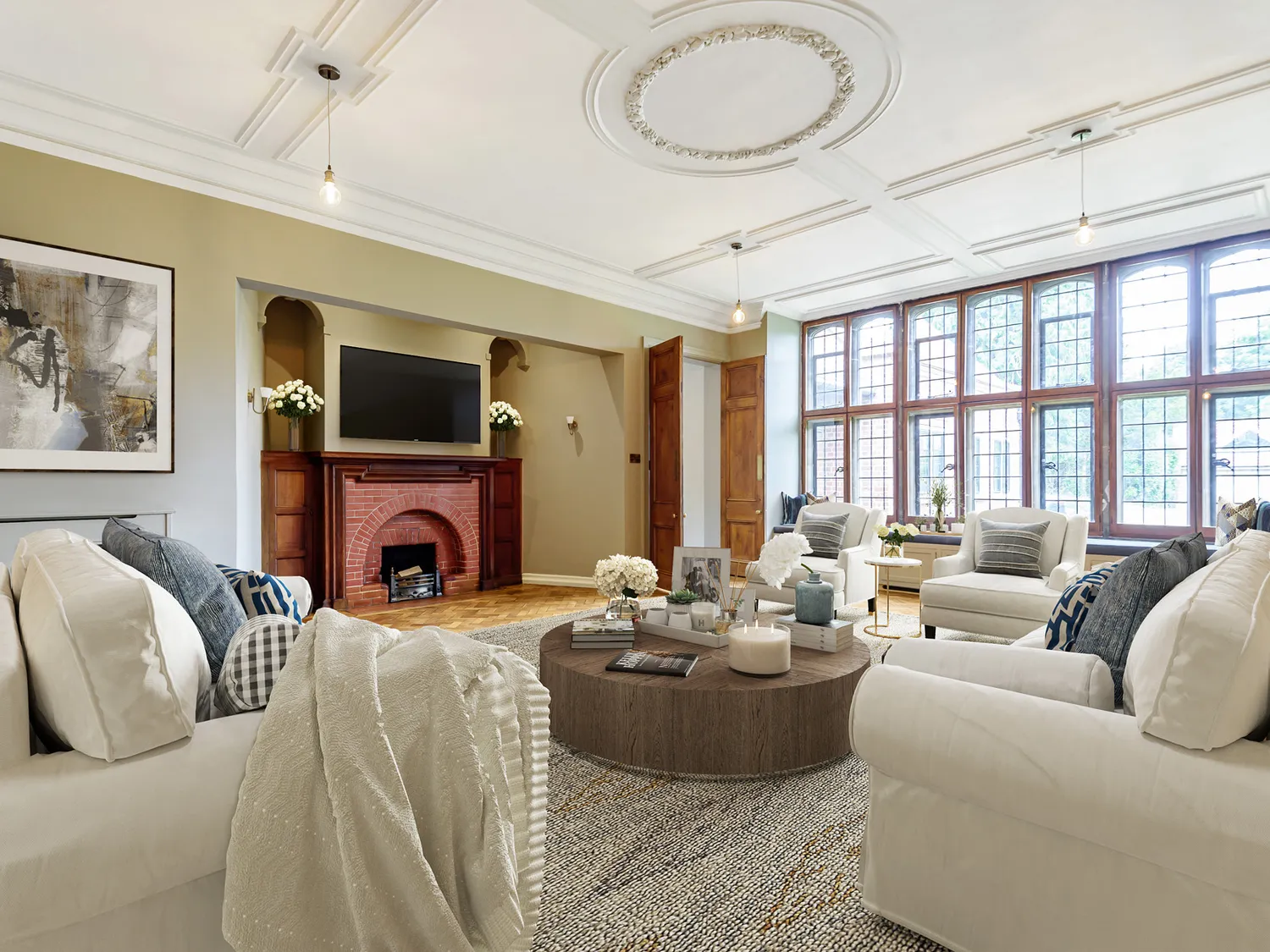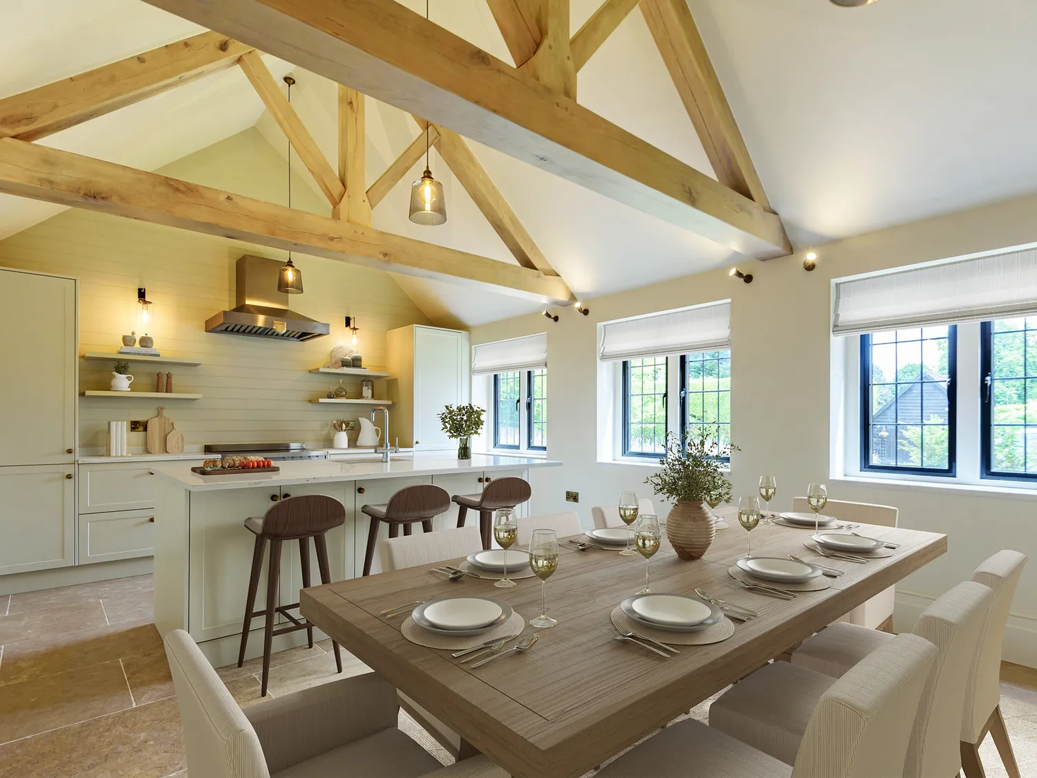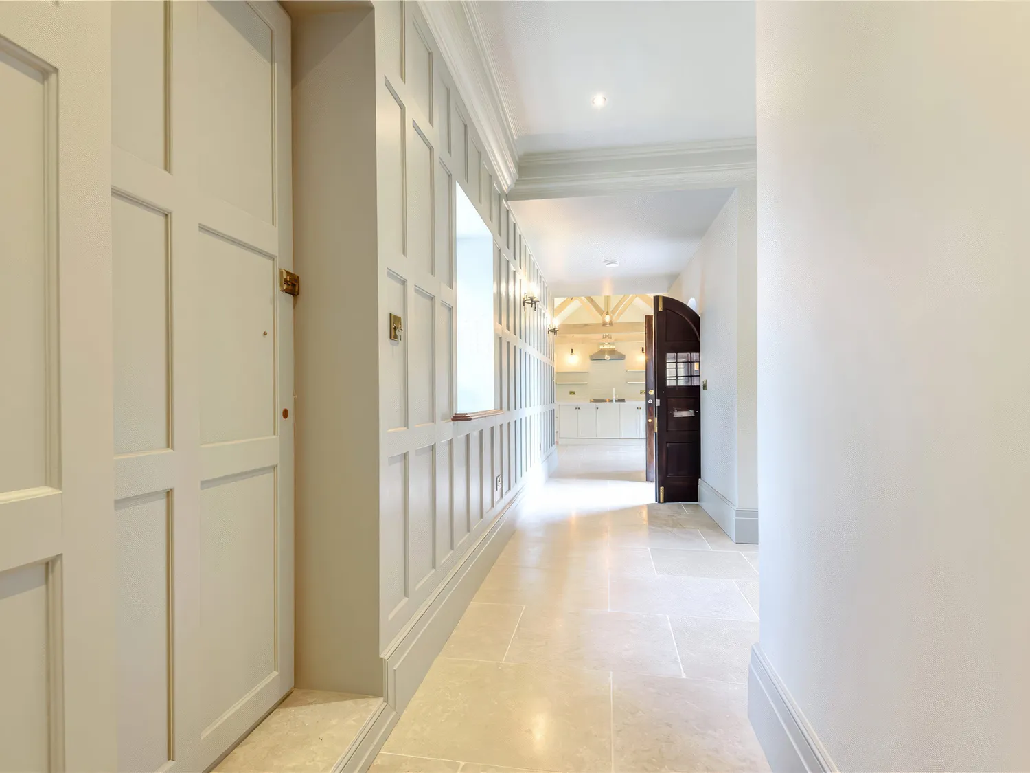The extension has been expertly designed to mirror the original architecture, featuring handcrafted leadwork, oversized gable ends and a perfectly balanced roofline that blends seamlessly with the historic structure. Inside, a beautifully panelled hallway with marble flooring leads to the bespoke kitchen and dining room, where high vaulted ceilings and exposed solid oak beams make an immediate statement. Period details feature throughout, offering superb entertaining spaces, abundant natural light and impressive ceiling heights.