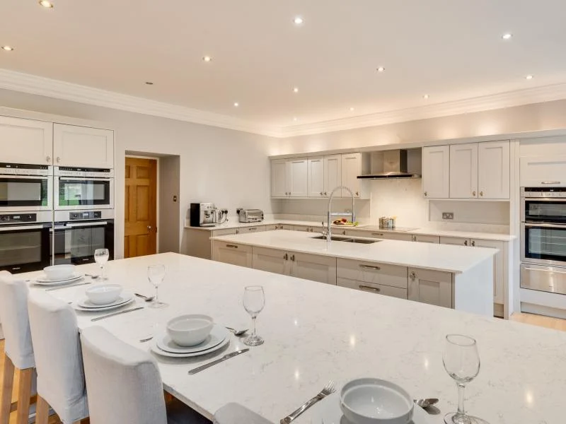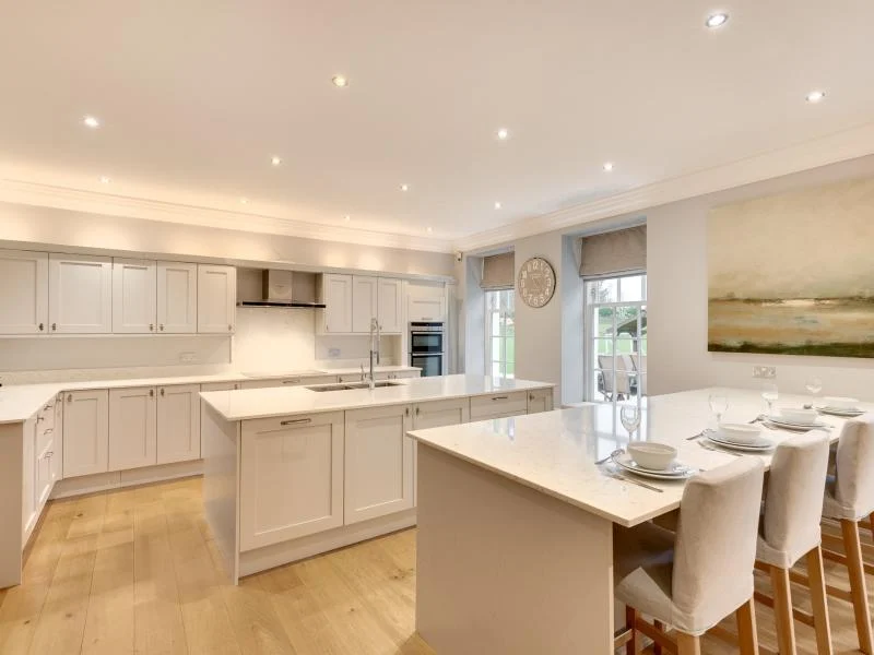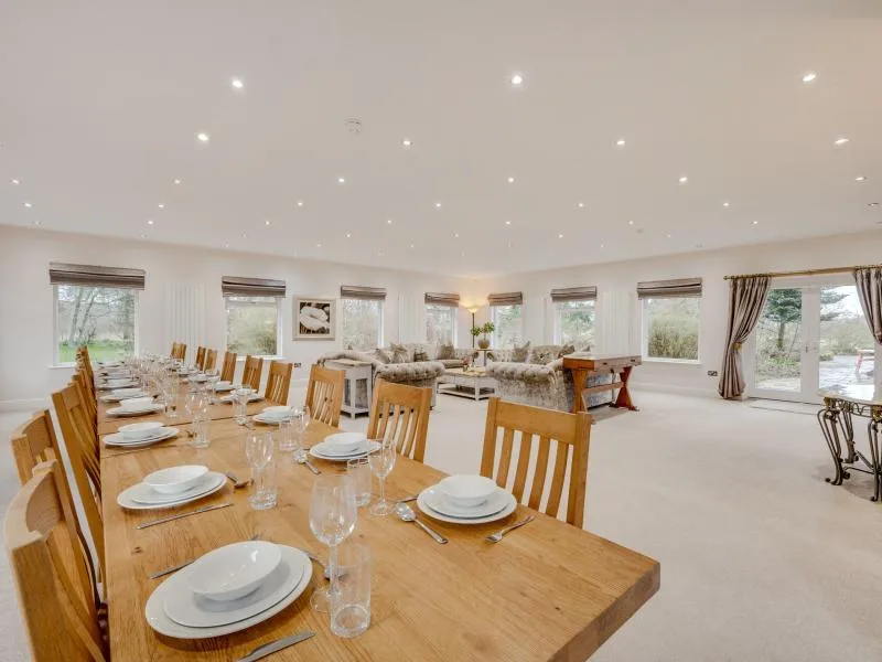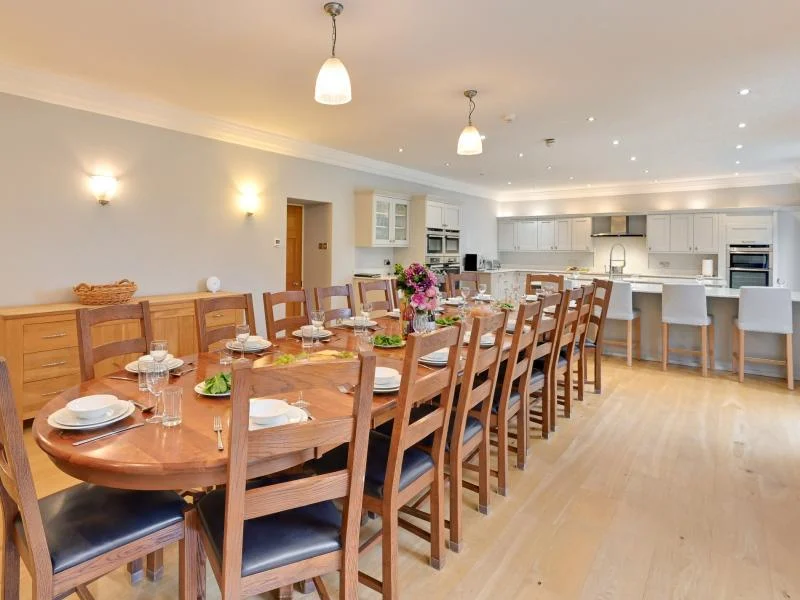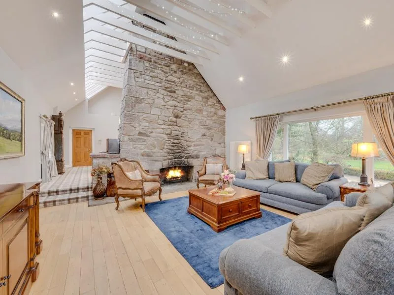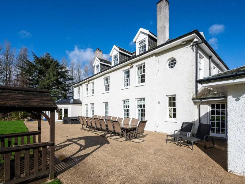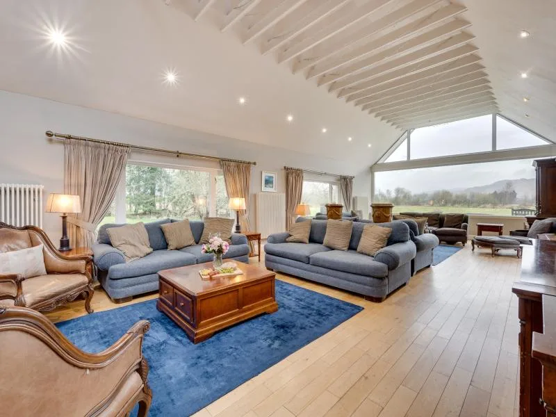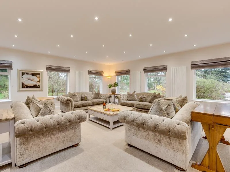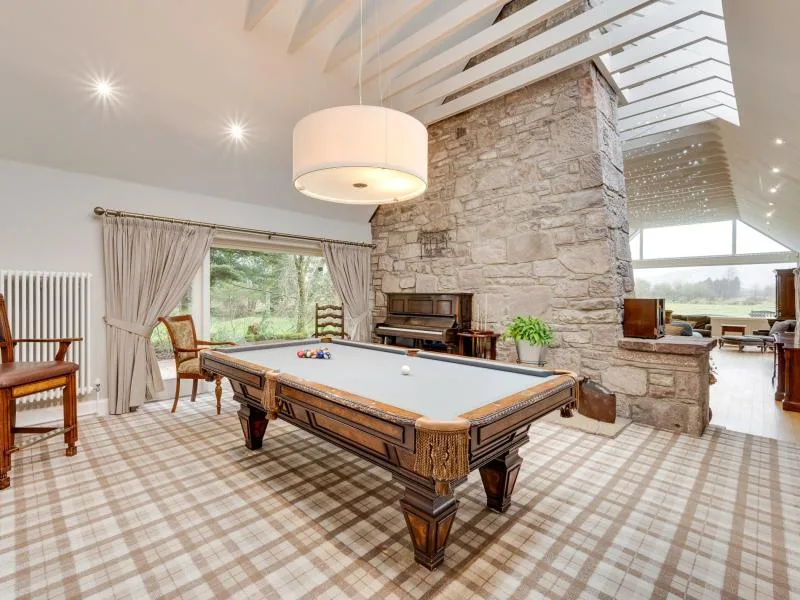 Inside, the house opens into a striking double-height Great Room with picture windows overlooking the lochans and hills. The ground floor features a games room with pool table, an elegant drawing room with central fireplace, a stylish kitchen/diner with high-spec appliances, a light-filled conservatory and a cosy TV room, along with two WCs. Upstairs are nine well-appointed bedrooms across two floors, many with en-suite facilities, including spacious family suites and luxurious master rooms.