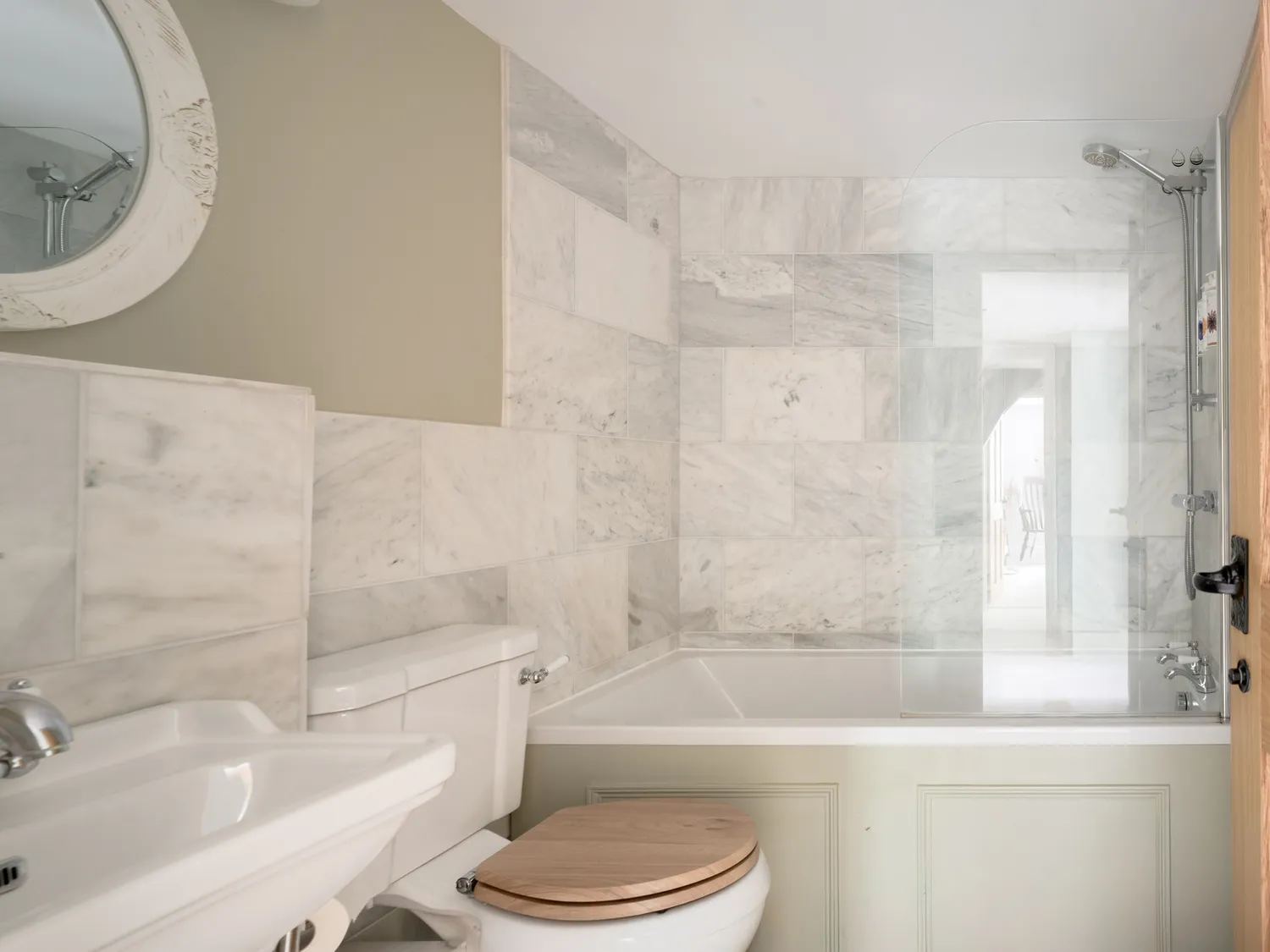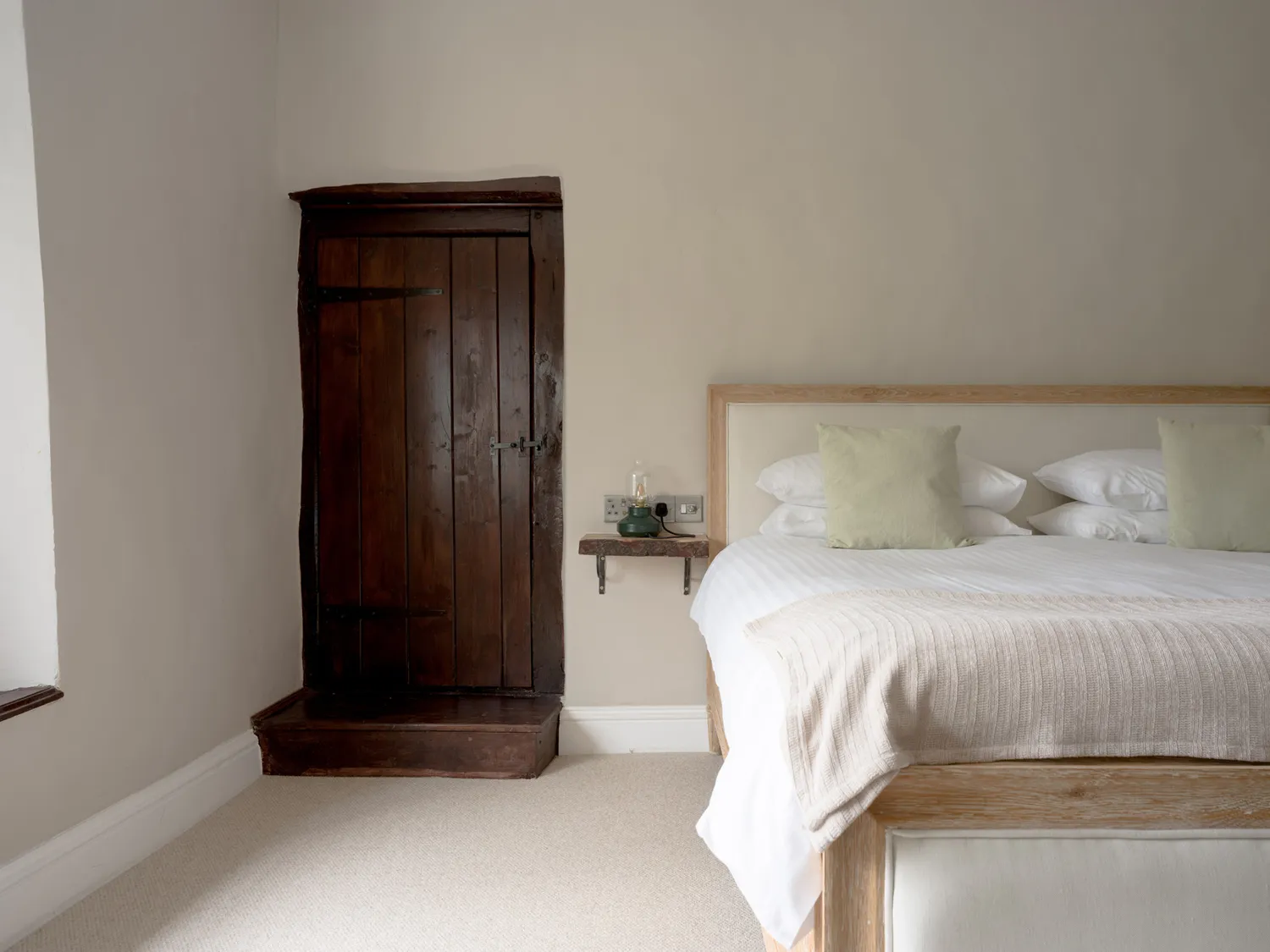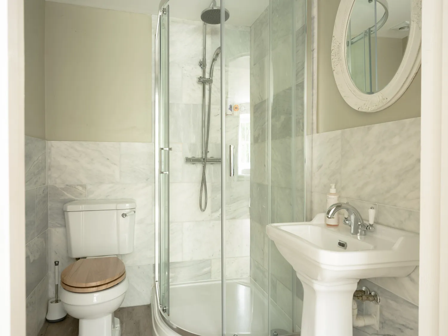 The farmhouse sleeps guests across six well-appointed bedrooms. On the ground floor is a single room with en-suite shower. Upstairs, there is a super-king-size bedroom with en-suite walk-in shower, a further super-king, two family rooms each with a super-king and twin beds, and an additional family room with a super-king and single. Three additional bathrooms and a separate shower room ensure easy mornings for larger groups.