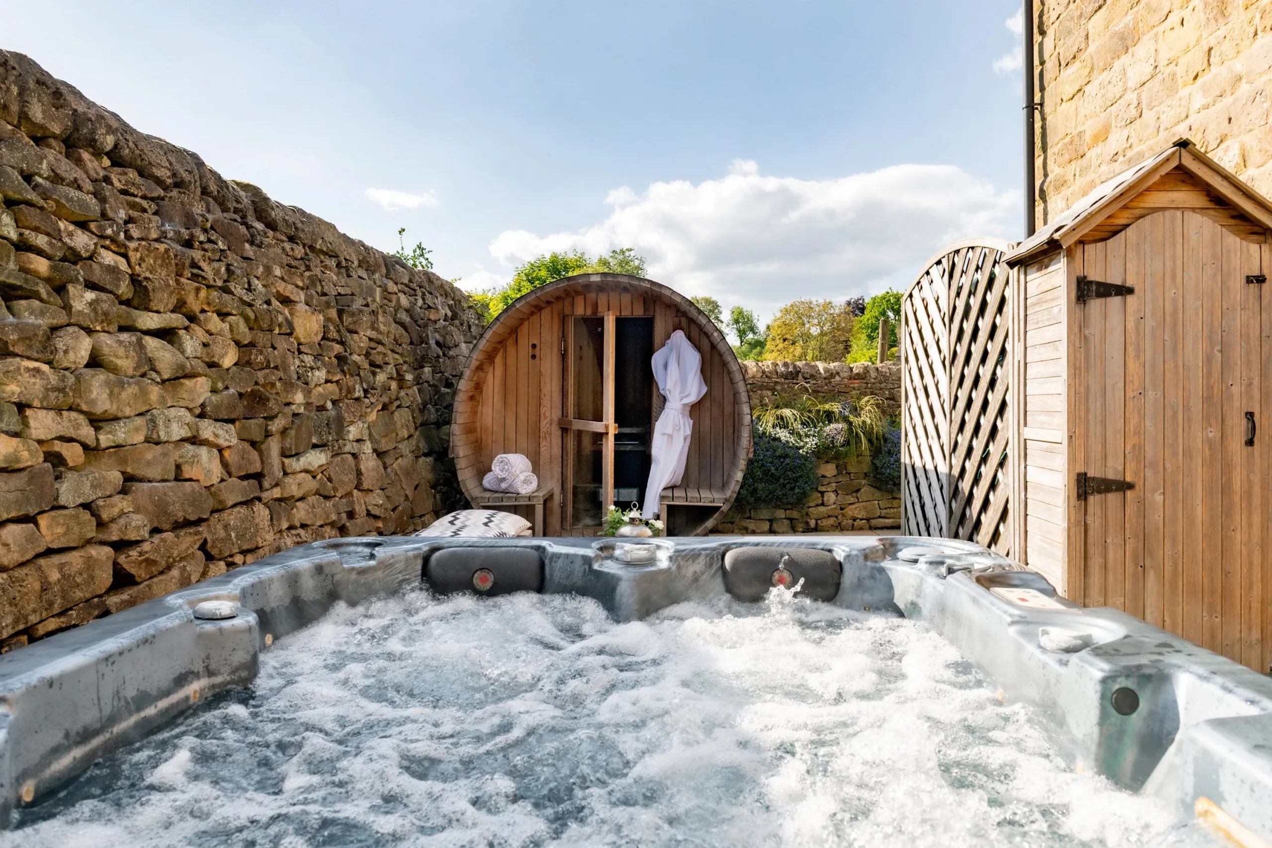 Inside and out you will find everything you need for an indulgent experience, treat yourself to a long soak in the double freestanding bath with views across the village over to the rolling countryside, sip something fizzy in your outdoor private hot-tub or kick back and relax with a book in the cosy sitting room.