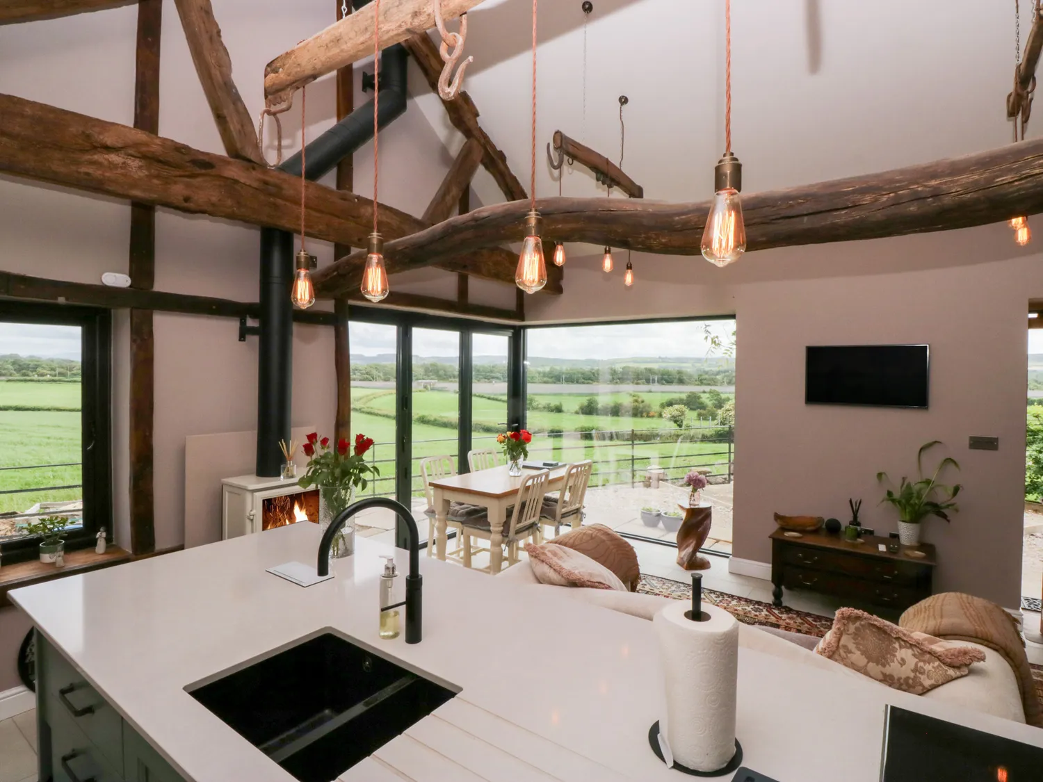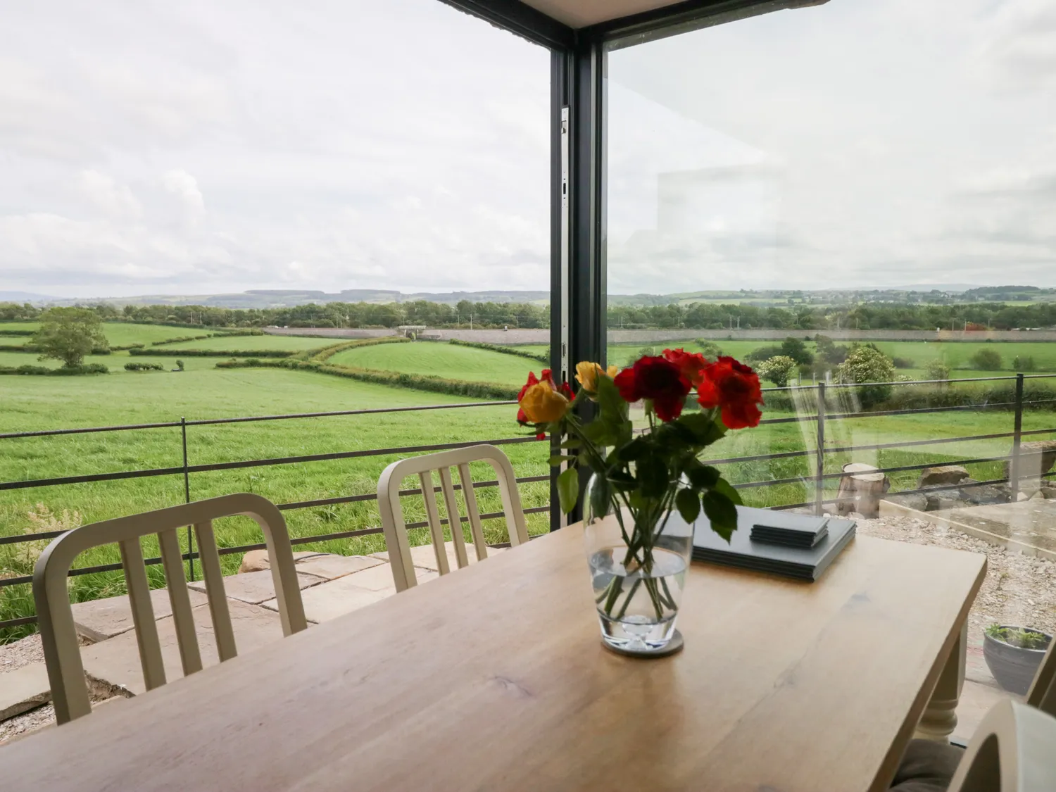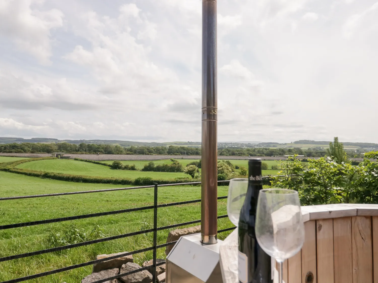 The open-plan living space is warm and welcoming, offering comfortable seating and a Smart TV for relaxed evenings. The well-equipped kitchen includes an electric oven and hob, with a generous dining table for home-cooked meals. On sunny days, enjoy alfresco dining on the garden furniture while taking in the stunning countryside, or unwind in the hot tub and soak up the views.