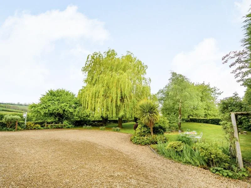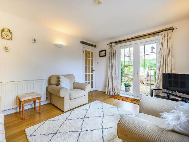 Upstairs are two well-presented bedrooms—a double and a twin—along with a family bathroom with shower over bath. Outside, an extensive garden and patio offer multiple seating areas, a BBQ for outdoor dining, and far-reaching rural views. Parking is available for two cars.