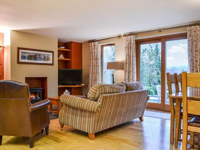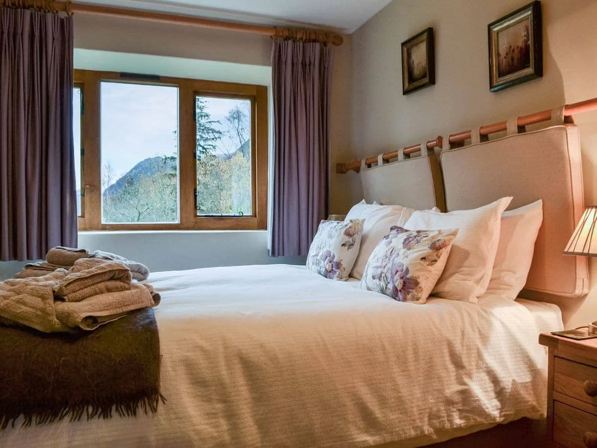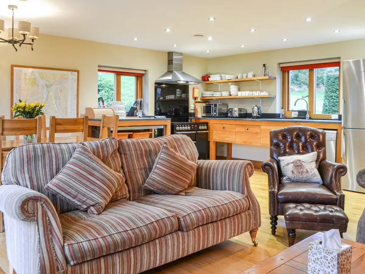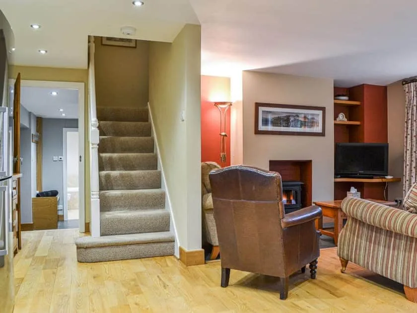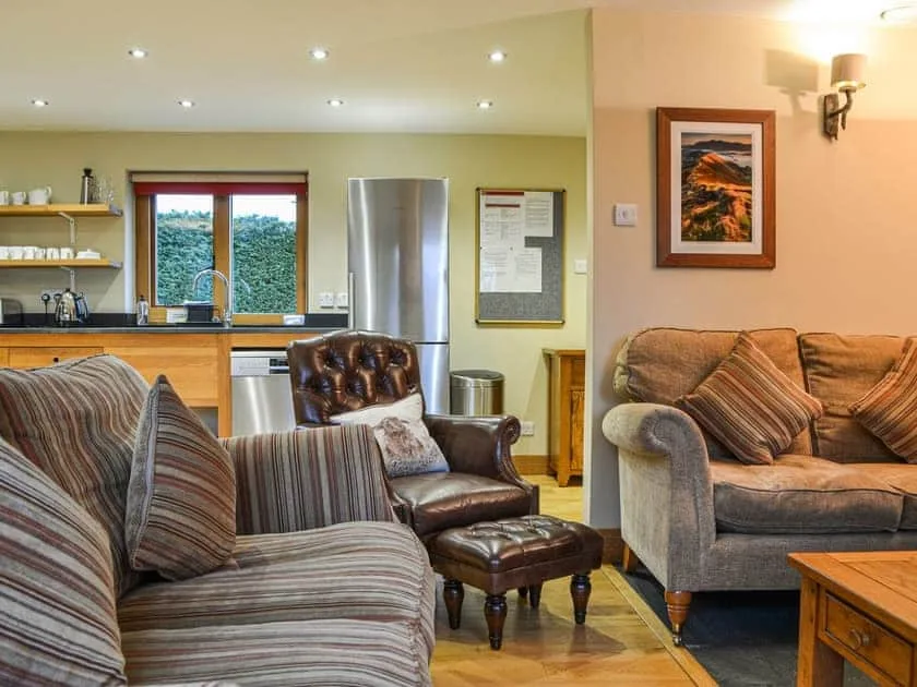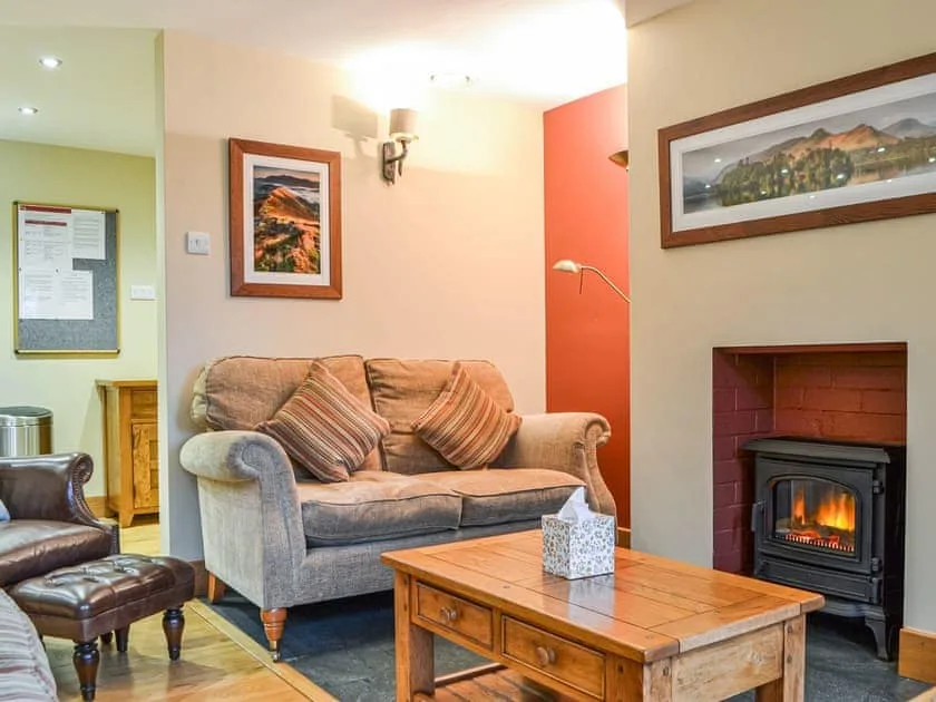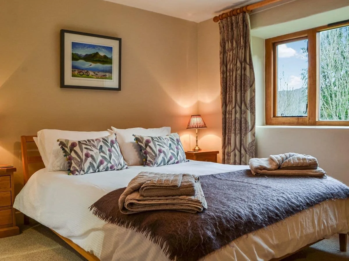 The heart of the home is the spacious sitting and dining area, complete with an electric-effect wood burner, solid wood floors and generous sofas. French doors lead out onto a large Lakeland slate terrace, perfectly positioned for outdoor dining while soaking up the breathtaking valley views. The adjoining handmade oak kitchen is well equipped with slate worktops, oven, microwave and large fridge freezer, with a solid oak table seating six for relaxed meals together.