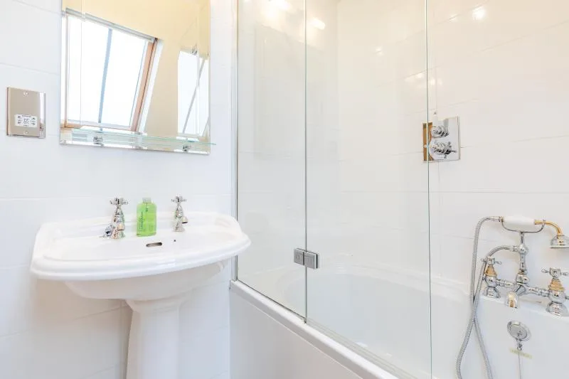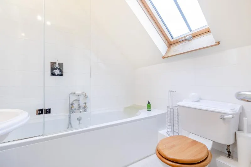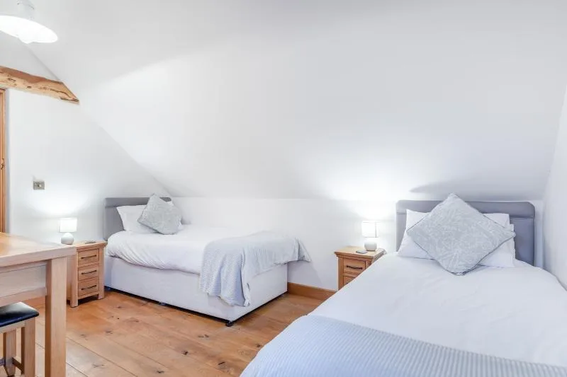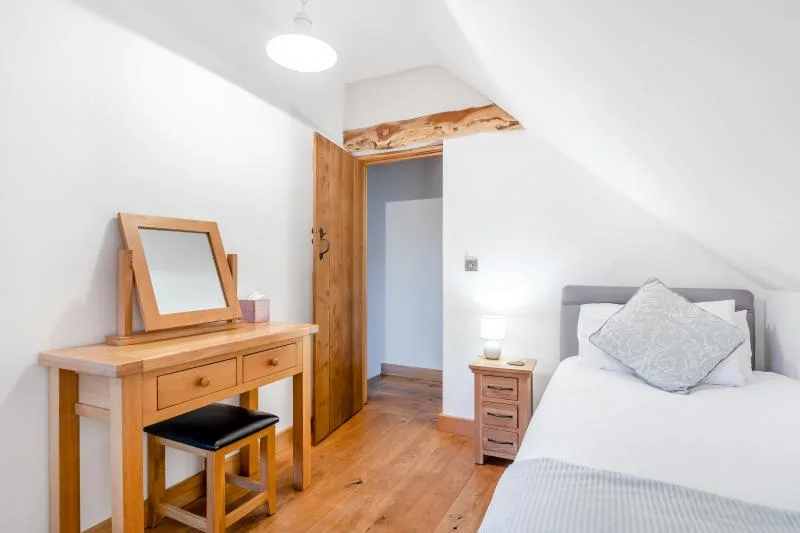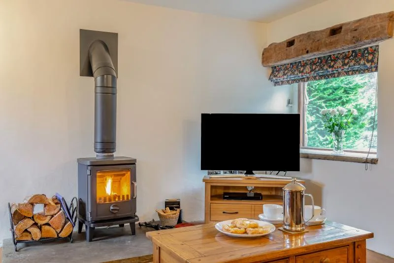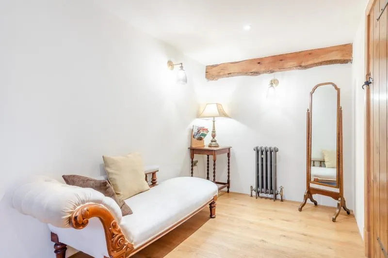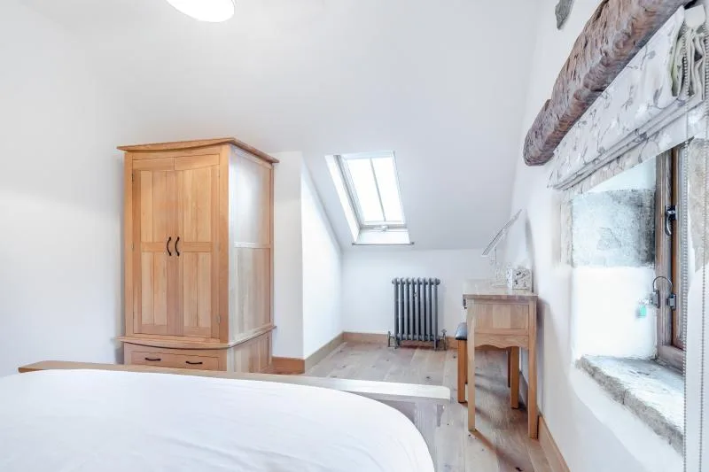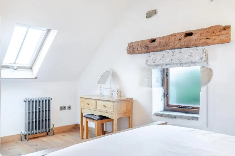 Inside, the cottage blends historic character with modern comfort, featuring exposed stonework, timber beams, underfloor heating and a calm, stylish décor. The thoughtfully designed kitchen makes holiday cooking a pleasure, leading down to an open-plan dining and lounge area where leather sofas, a woodburning stove and TV create a cosy space to relax. A ground-floor WC completes this level. Upstairs are two charming bedrooms tucked into the eaves, along with a family bathroom.