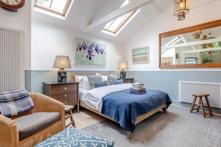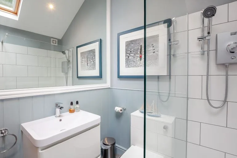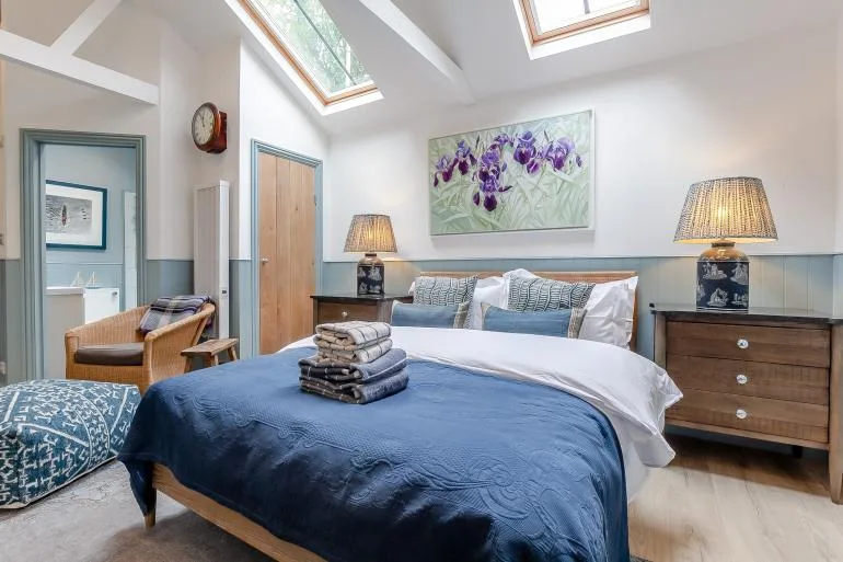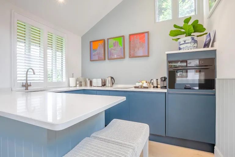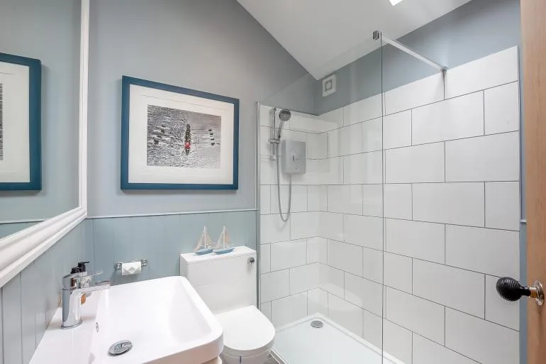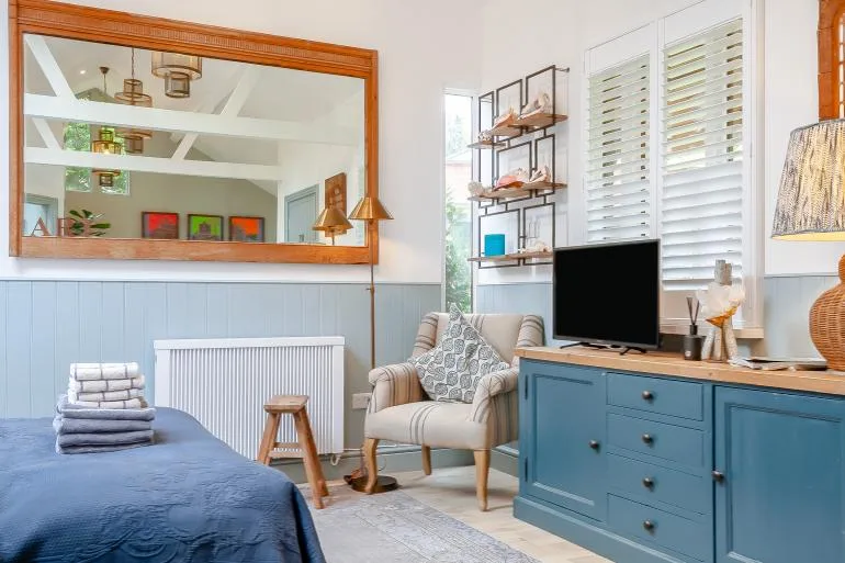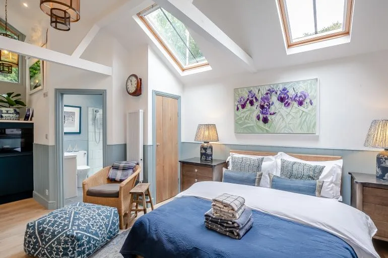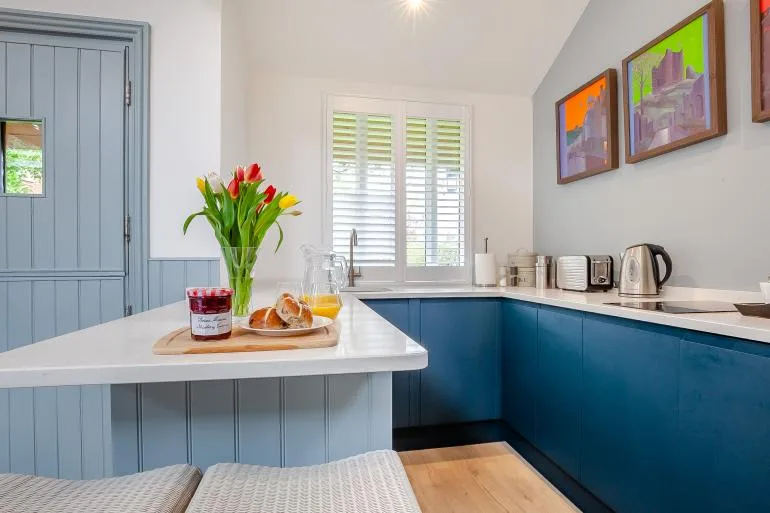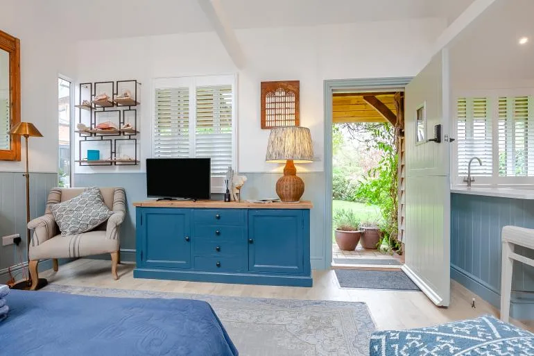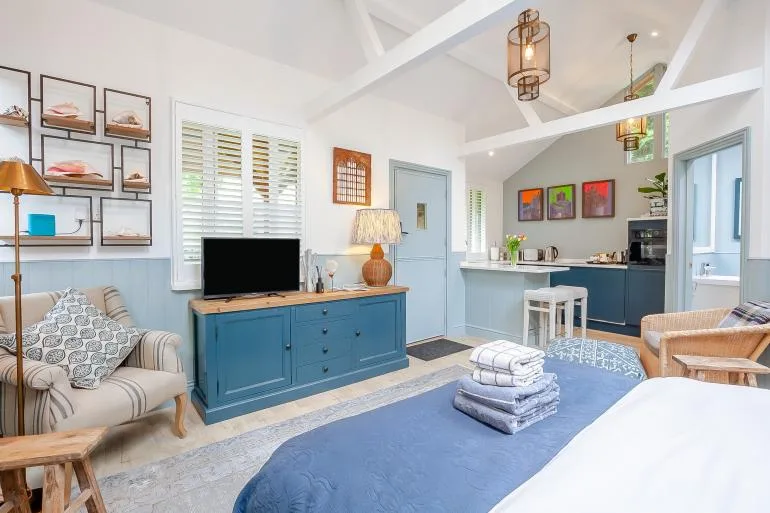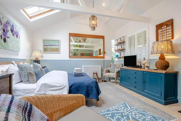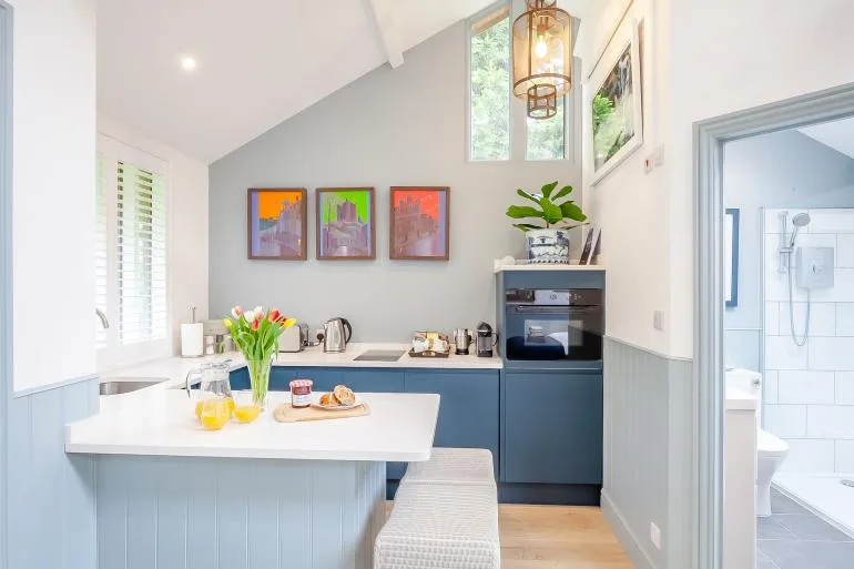 The front door opens into a stylish, open-plan studio living space, thoughtfully designed for comfort and relaxation. Light and welcoming, it features a plush king-size bed, two cosy armchairs, and a Smart TV for laid-back evenings in. The compact yet well-equipped kitchen includes everything needed for simple meals, with a breakfast bar providing a lovely spot for morning coffee or casual dining. A modern shower room with a walk-in shower and WC completes the interior.