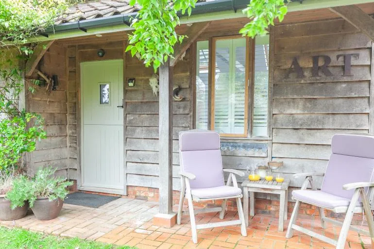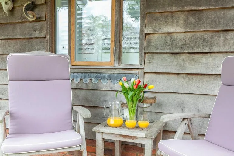 Outside, guests can unwind in the covered seating area with a table and chairs, overlooking the owner’s beautifully kept garden—a peaceful setting for enjoying a drink or a quiet moment outdoors.