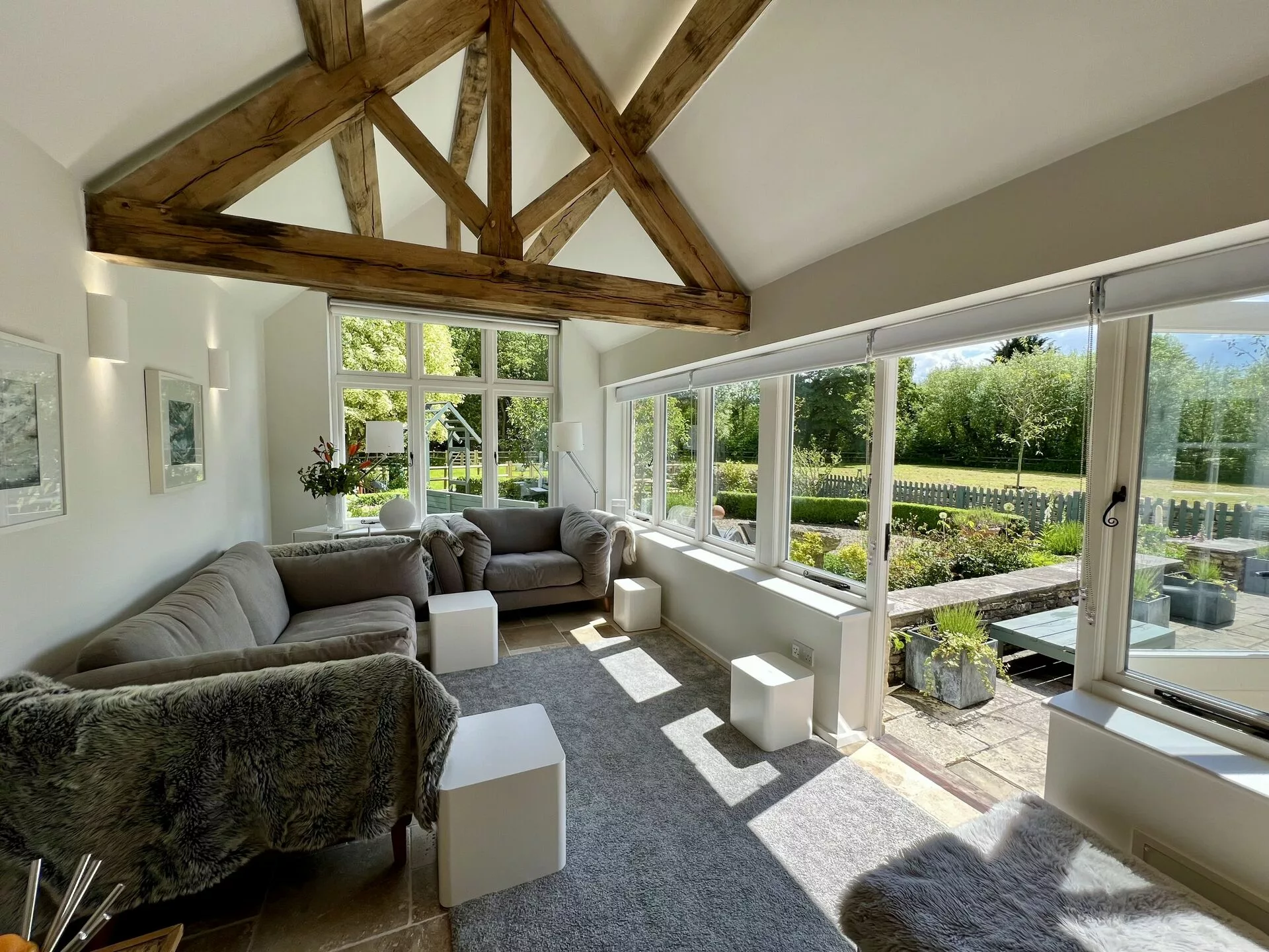 Each first floor wing of the house is accessed by its own staircase leading to two double bedrooms and a family bathroom. The master bedroom of each wing has a king-size bed and floor to ceiling windows complete with Juliet balcony overlooking the gardens and woodlands.