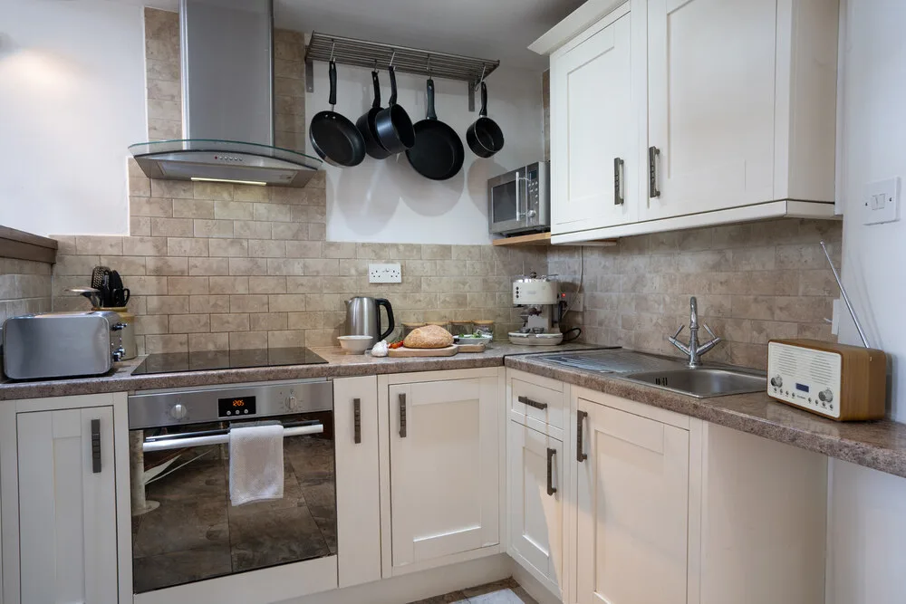 The cottage then opens into a well equipped kitchen before leading, up three gentle steps, into the heart of the home. Here, the magnificent sitting room immediately captures your attention. With its vaulted ceiling, exposed beams and cosy woodburning stove, it’s a wonderfully atmospheric space — perfect for curling up with a good book or relaxing with a glass of wine as the fire crackles nearby.