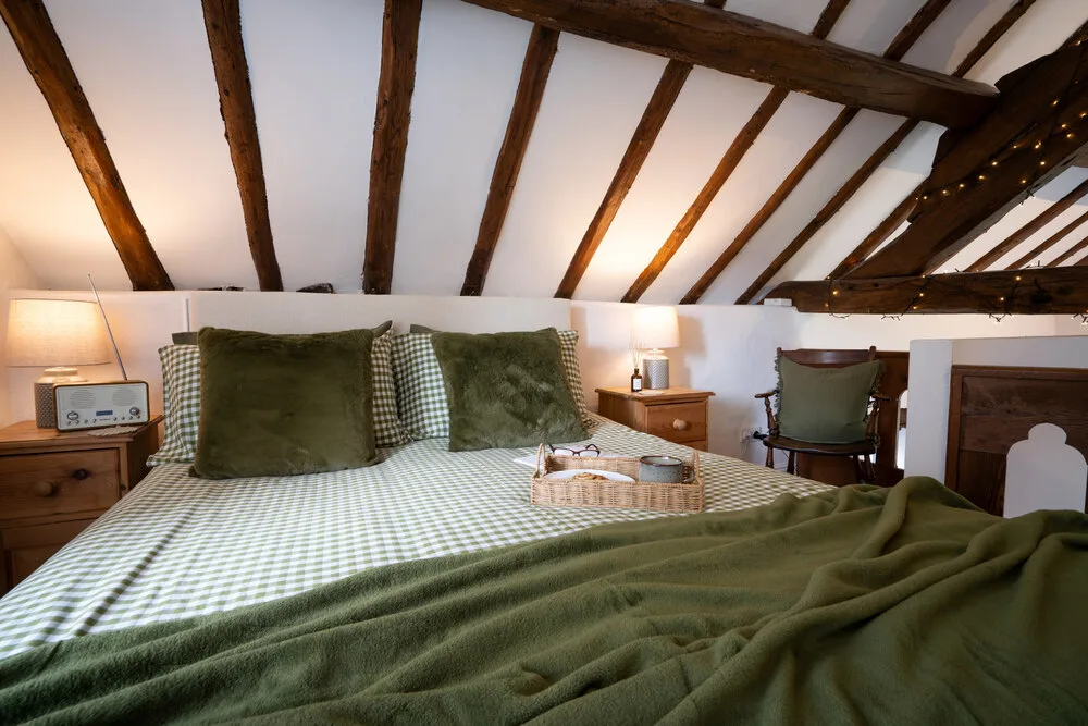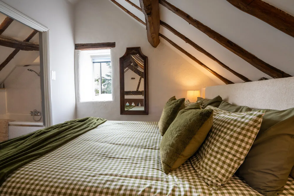 Above the sitting room, reached by a charming spiral staircase, the mezzanine bedroom offers a beautiful and intimate space to unwind. Wooden carved beams and a softly curved ceiling echo the building’s history, while the elegant en-suite bathroom provides a touch of comfort and indulgence.