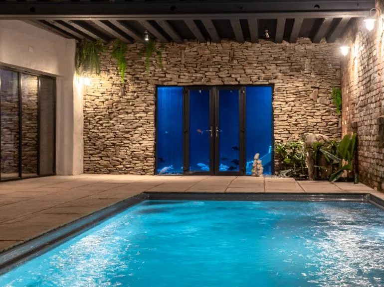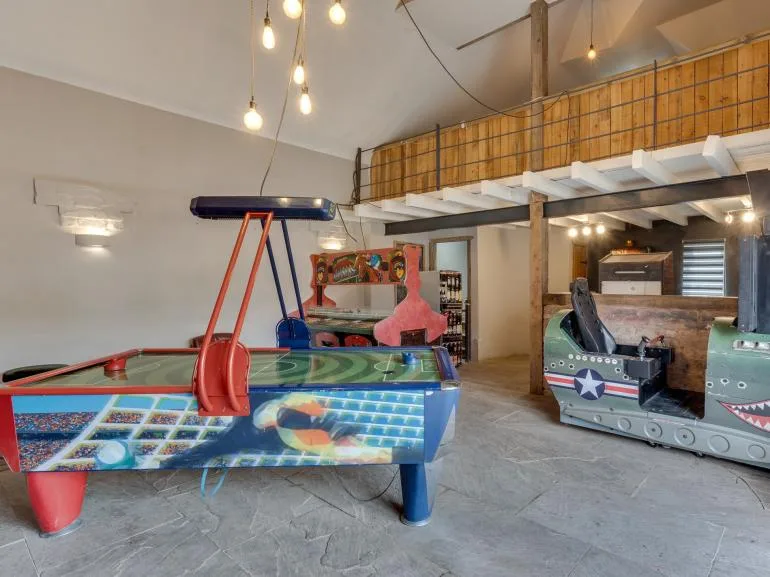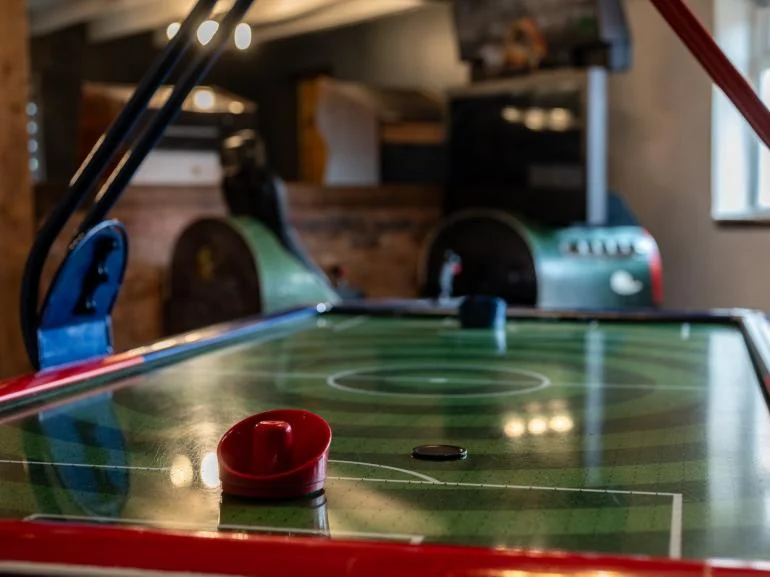 The fun continues in the games room, featuring retro arcade machines, table football, an air hockey table, and a cosy seating area—perfect for catching up with friends. New to the house are an indoor swimming pool and sauna for guests to enjoy.
