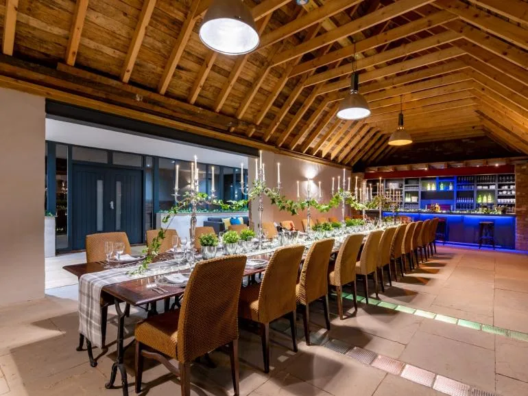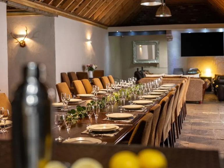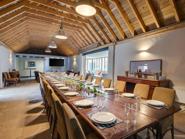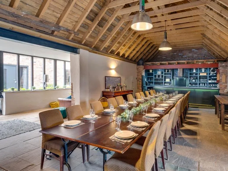 The property features a spacious central hub perfect for bringing everyone together. A huge dining table seats 26 guests, while the adjoining kitchen and lounge area is fully equipped with two electric ovens, a hob, two fridges, a freezer, dishwasher, and microwave. Whether you’re cooking for the group or hiring a private chef to cater your celebration, the space has everything you need. Unwind on the plush sofas in front of the 88” Smart TV before heading downstairs to the soundproof private nightclub—complete with jukebox sound system, stage, lighting, and a private bar where you can pour your own pints. For added convenience, there are two separate WCs in the main barn.