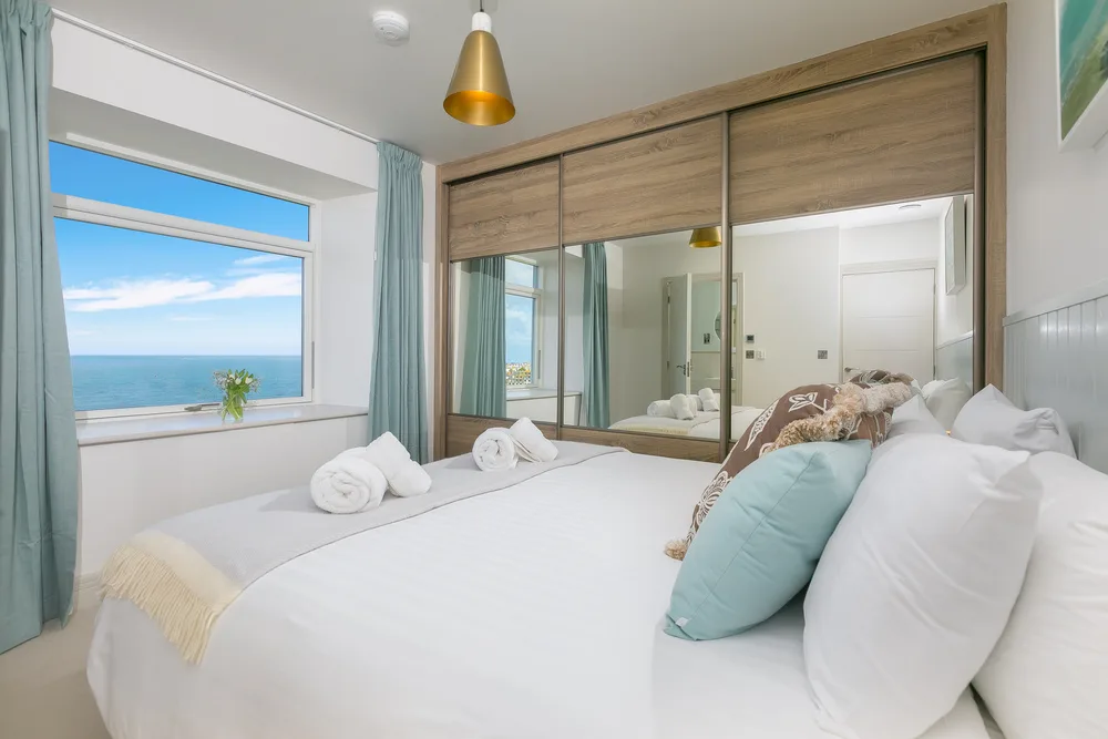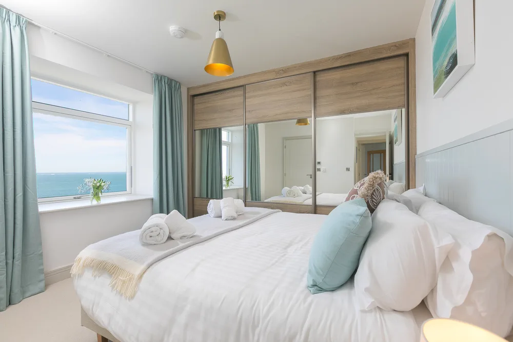 The master bedroom offers ultimate relaxation with a super king size bed and an en suite bathroom, complete with walk in shower, creating a private oasis to unwind.