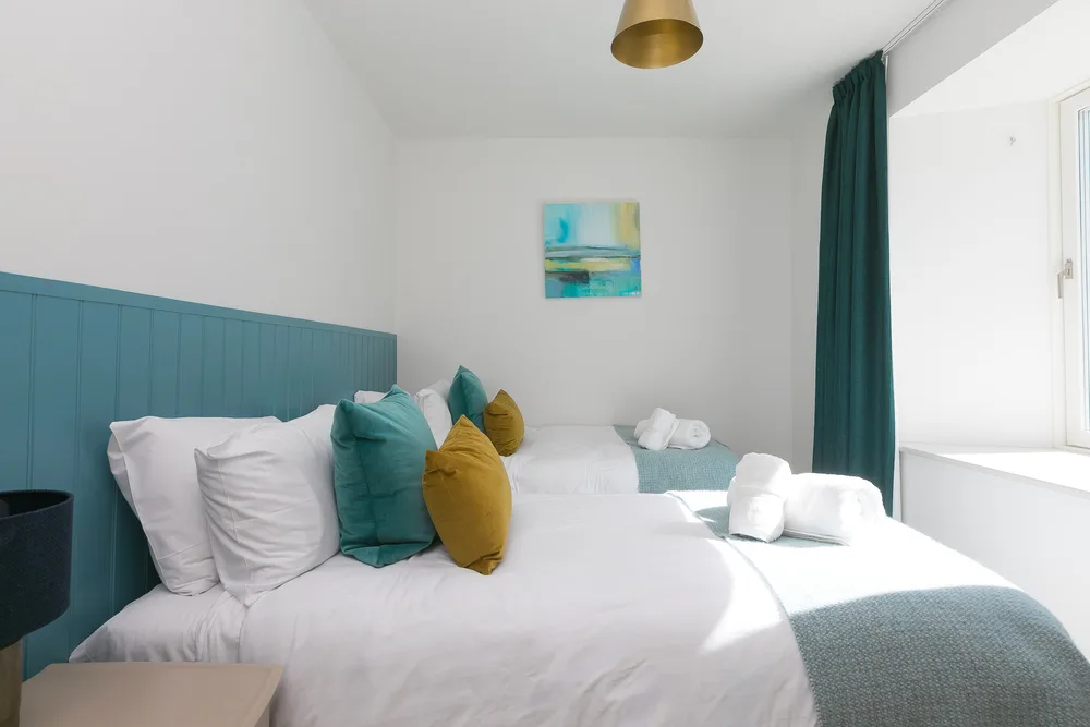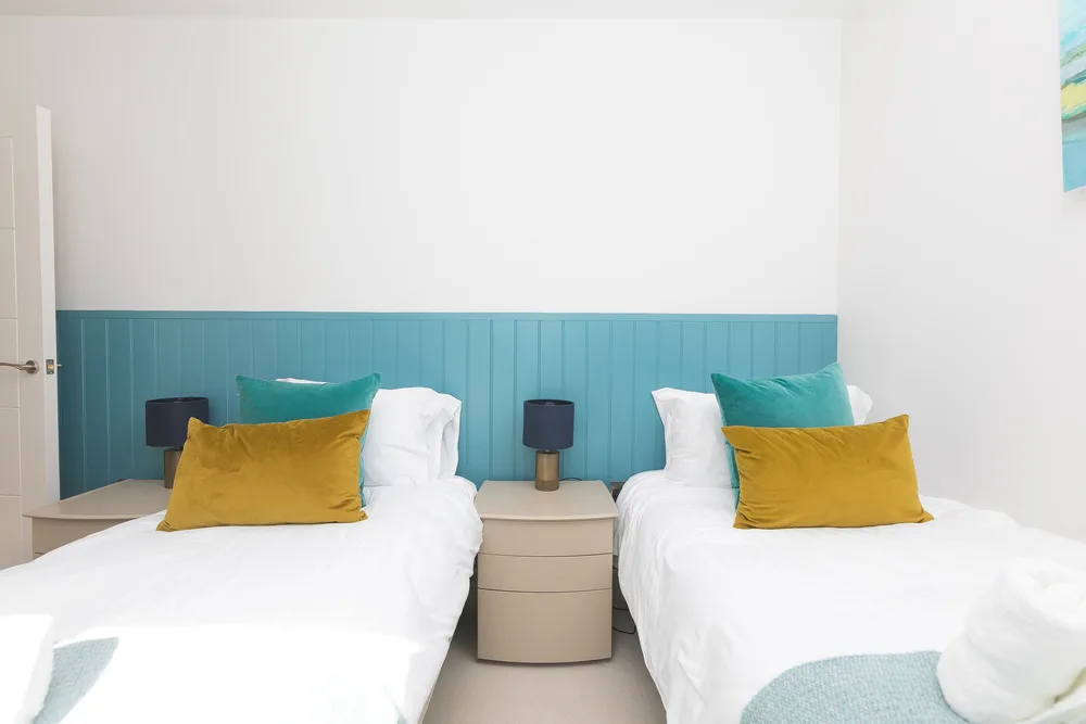 The third bedroom is ideal for younger guests or those preferring separate beds, this charming room offers twin beds and easy access to the family bathroom.