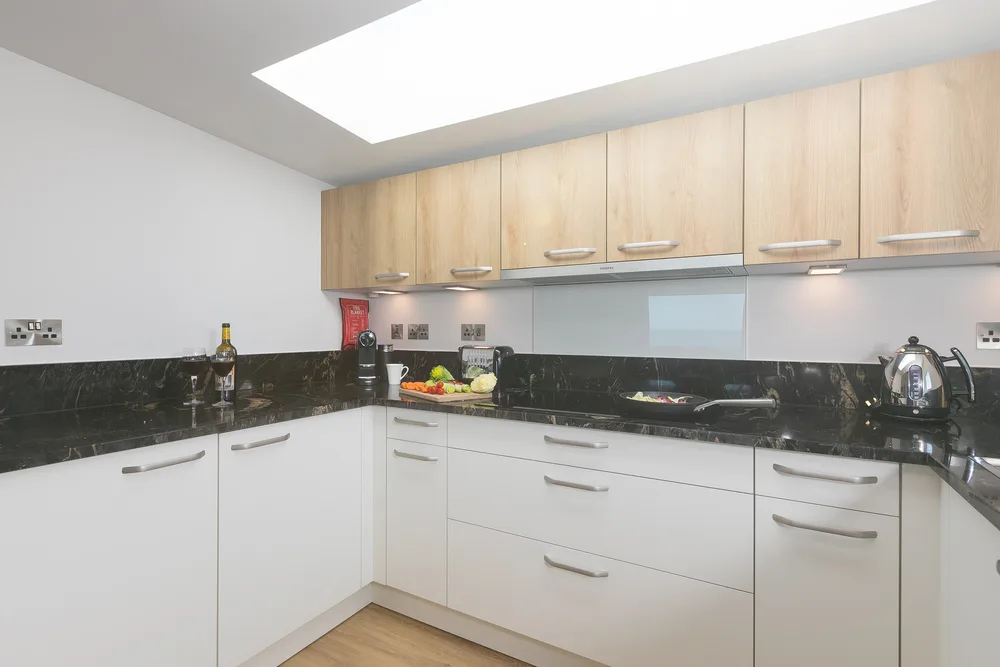 The heart of the home boasts a stunning open-plan kitchen, dining and living space with vaulted ceilings that create a bright, airy atmosphere. The kitchen features sleek quartz worktops and a breakfast bar, perfect for casual dining or socialising. Underfloor heating ensures a comfortable feel throughout, while the spacious dining table with seating for eight provides a wonderful space for meals and evening entertainment.