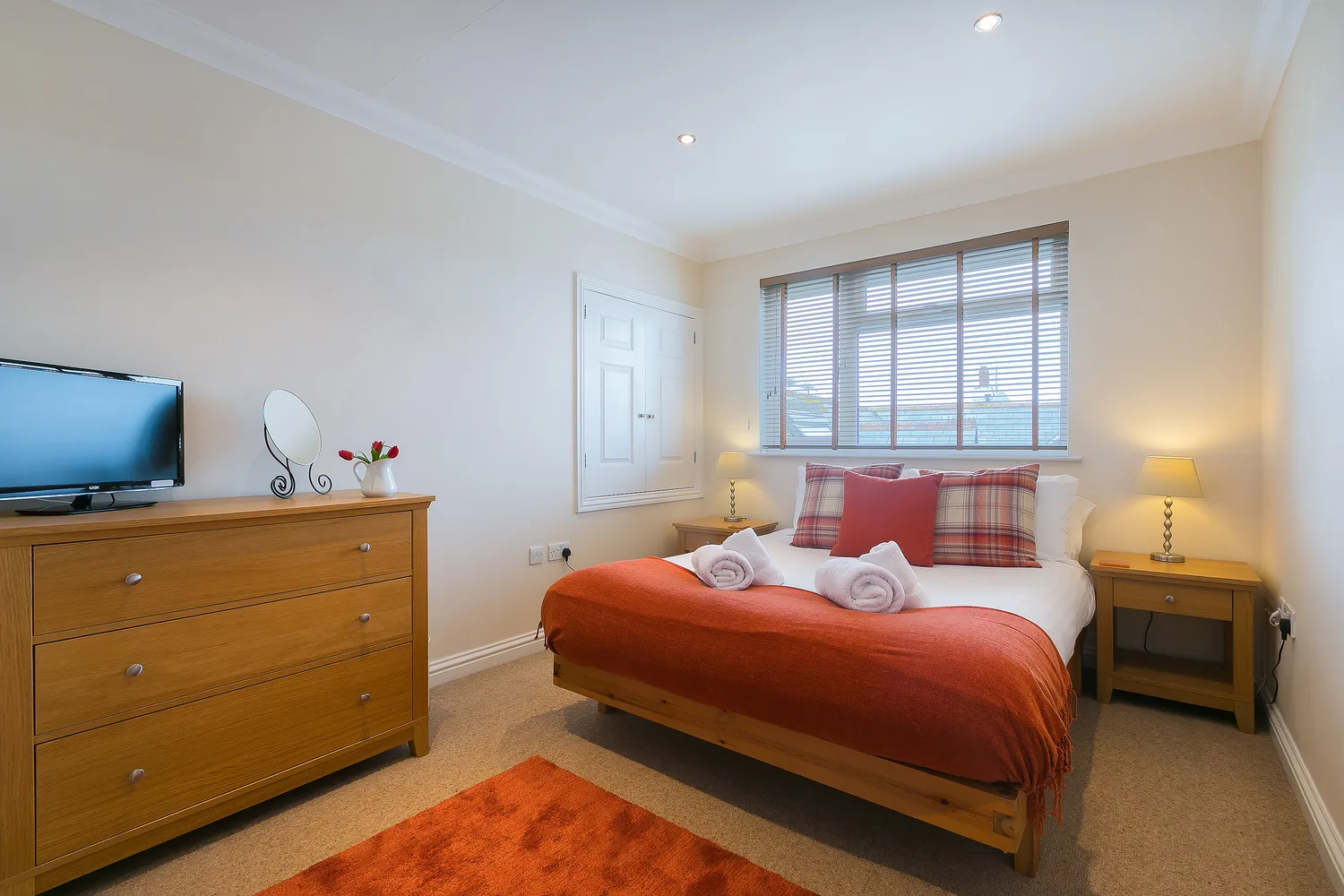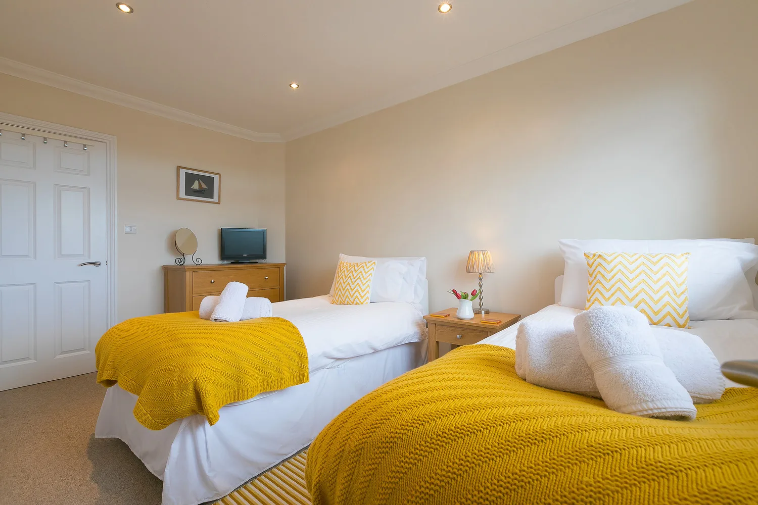 The second bedroom has twin beds with a chest of drawers and a TV.
