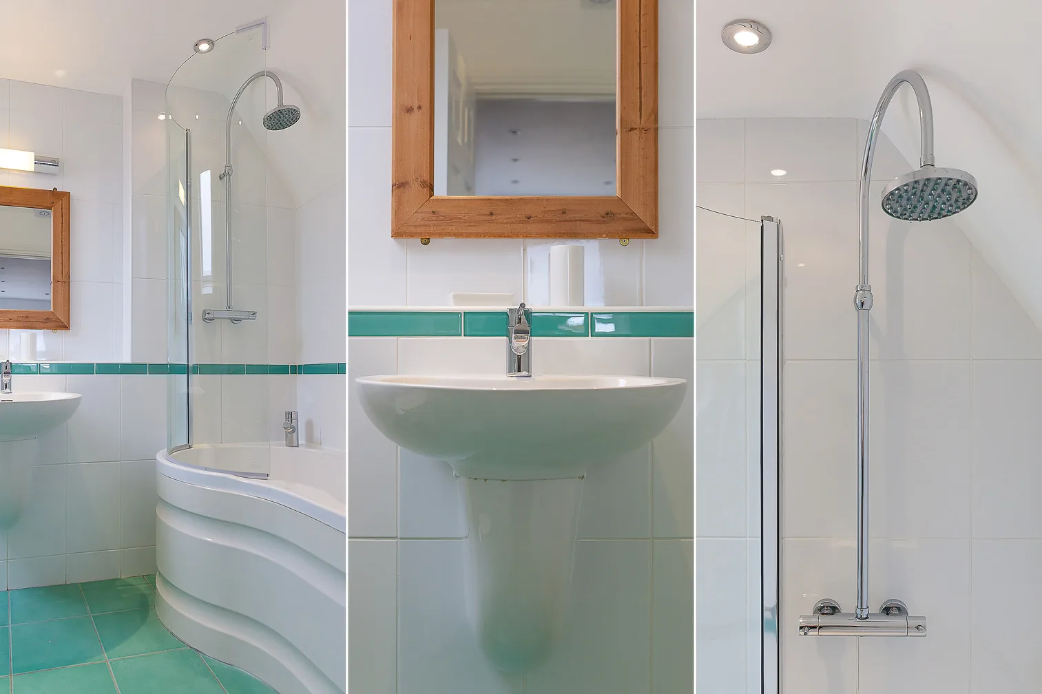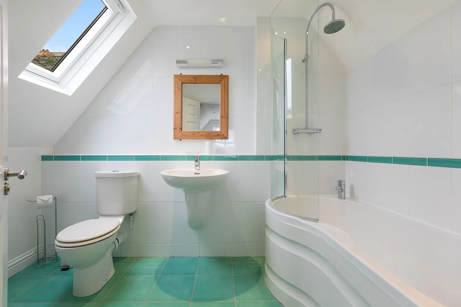 The modern, light bathroom has a bath with shower over, toilet and wash hand basin.