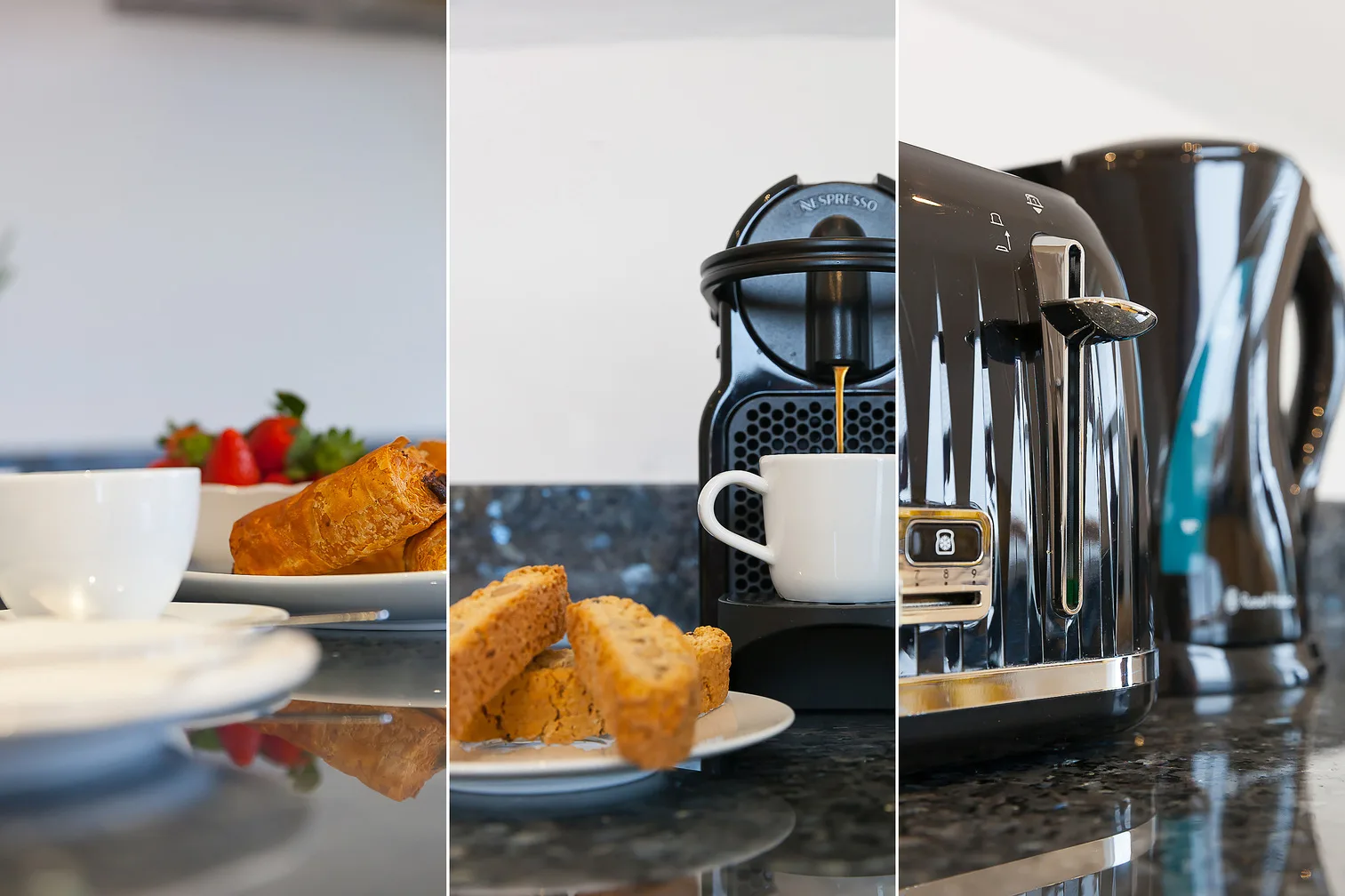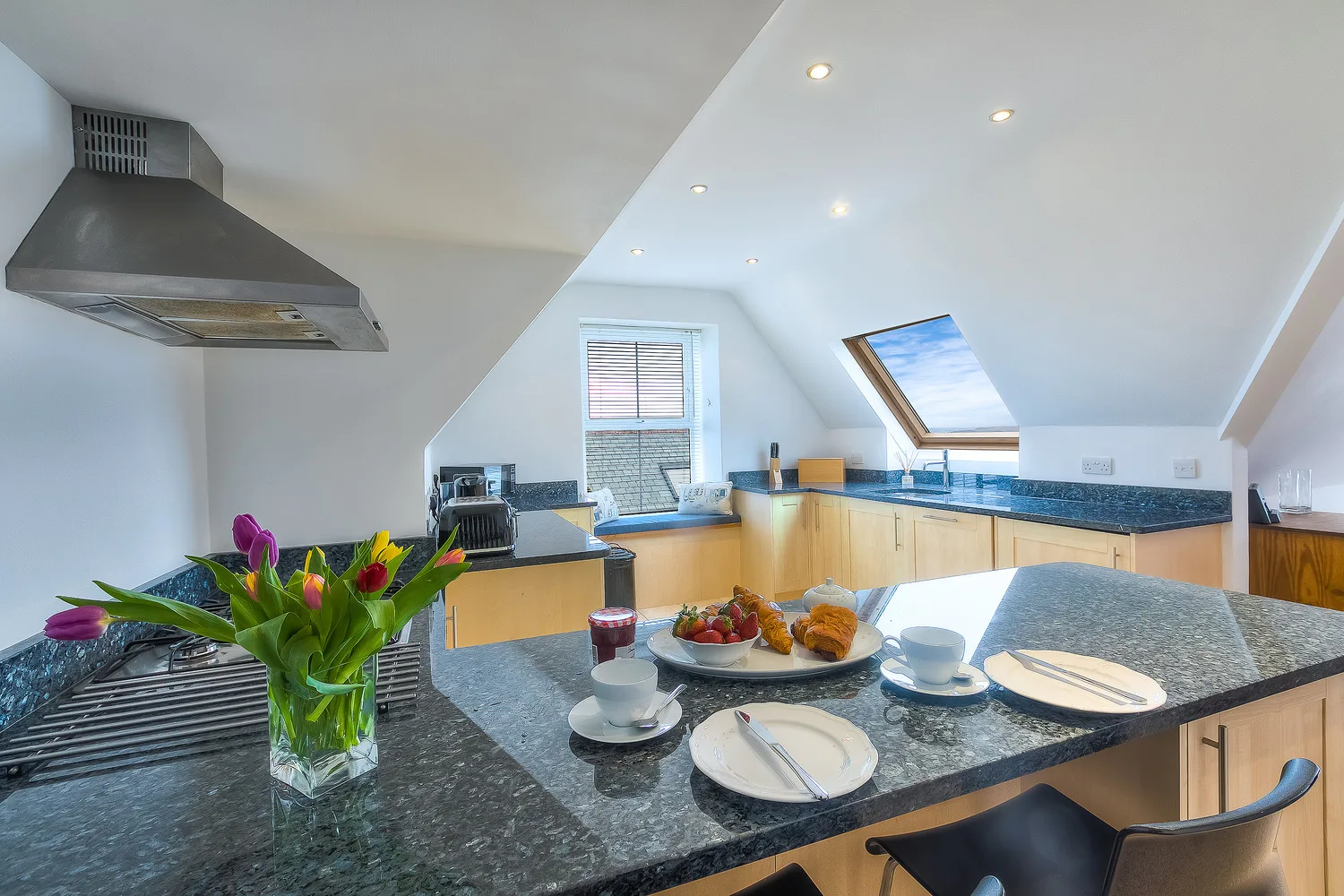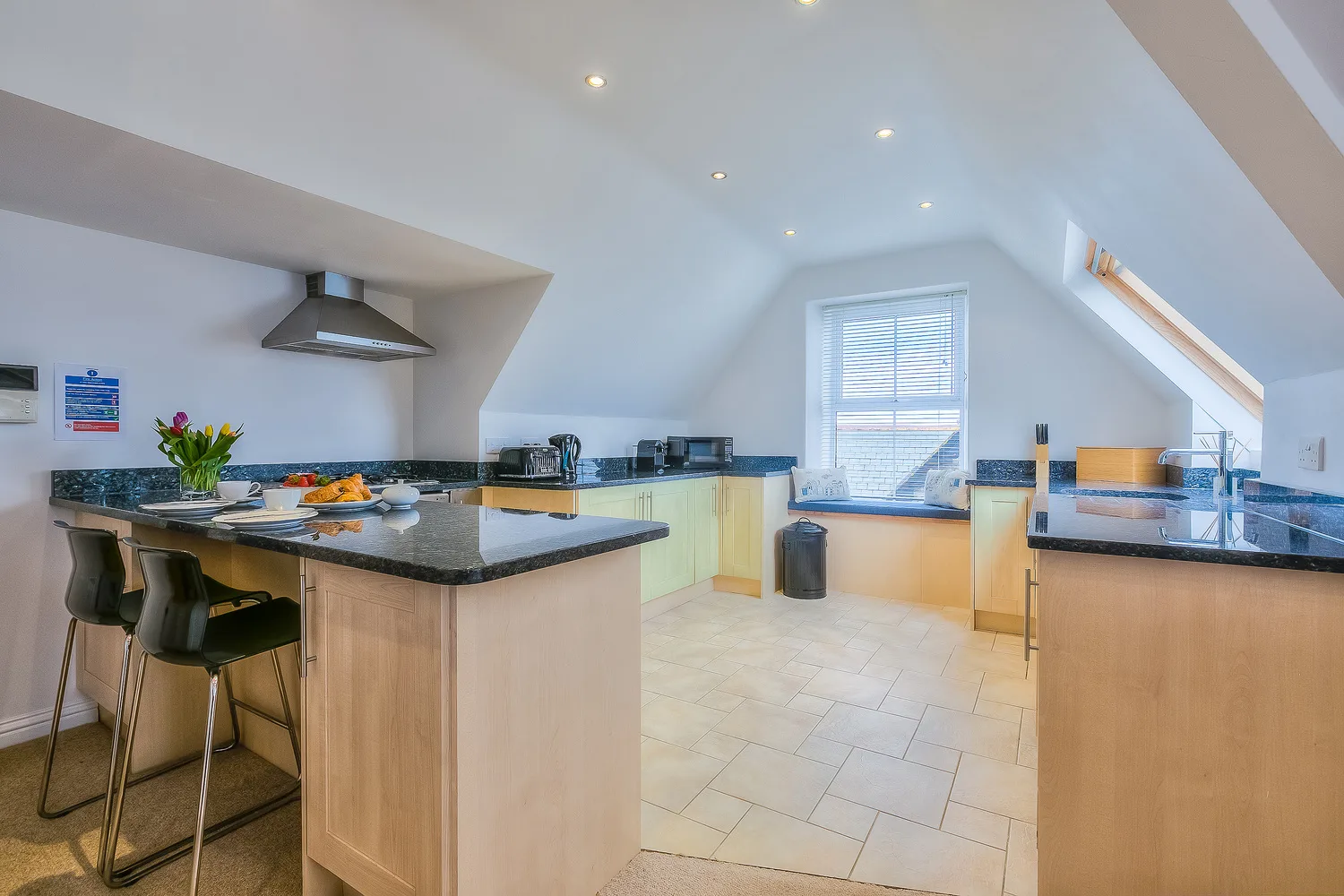 The fully equipped, spacious kitchen has everything you need for the perfect stay with a washer/dryer, fridge, freezer and dishwasher all built in. There is also a Nespresso coffee machine, microwave and a gas hob and oven. The dining table seats six.