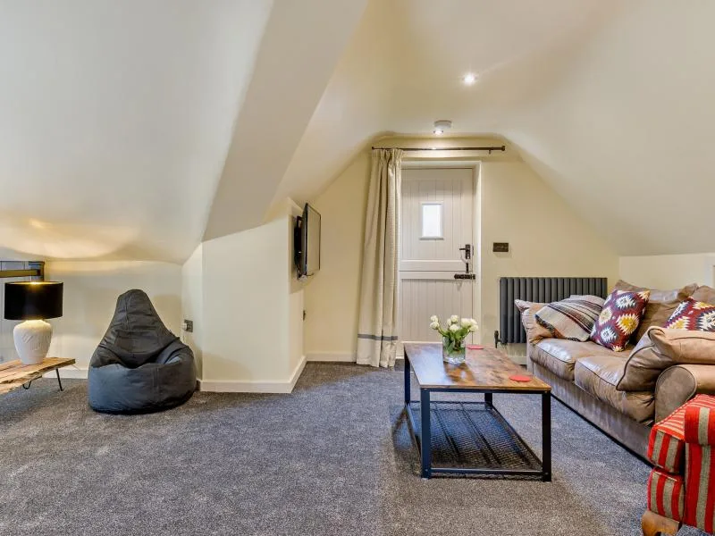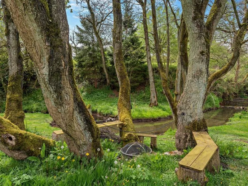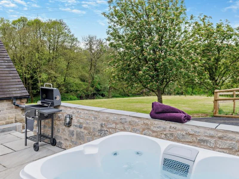 Outside, guests can enjoy a private patio with seating, BBQ and hot tub, ideal for evenings under the stars. The wider grounds include peaceful lawns, a babbling brook and a fire pit area with fairy lights, creating a truly memorable Peak District escape.