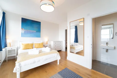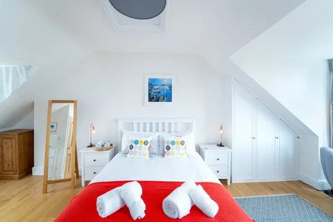 The second bedroom is located on the first floor with a double-sized bed, ample storage, and stunning views across Porthmeor and Godrevy Lighthouse. There is also an en-suite shower room, wash-hand basin, and WC.
