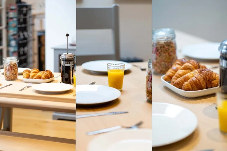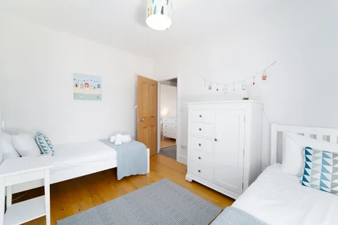 The third bedroom, also on the first floor, is delightfully decorated in white, grey, and blue tones and offers two single beds with ample storage.