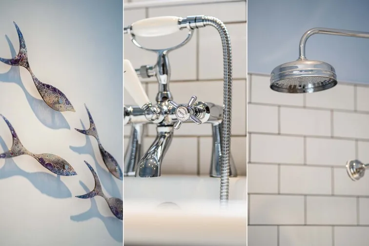 The lounge area is spacious with a large three-seater and two-seater sofa, Smart TV, decorative fireplace, and stunning sea views. There are also two comfy chairs and a large selection of books, games, and table football, perfect for family nights in. The lounge is tastefully decorated in crisp white, blues and greys which lends itself to a relaxing and calming environment.